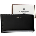 Poziomy portfel damski ze skóry naturalnej i ekologicznej w czarnym kolorze zamykany zatrzaskiem - Peterson