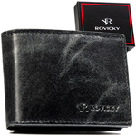 Czarny portfel męski ze skóry naturalnej mieszczący dowód rejestracyjny i wyposażony w system RFID - Rovicky