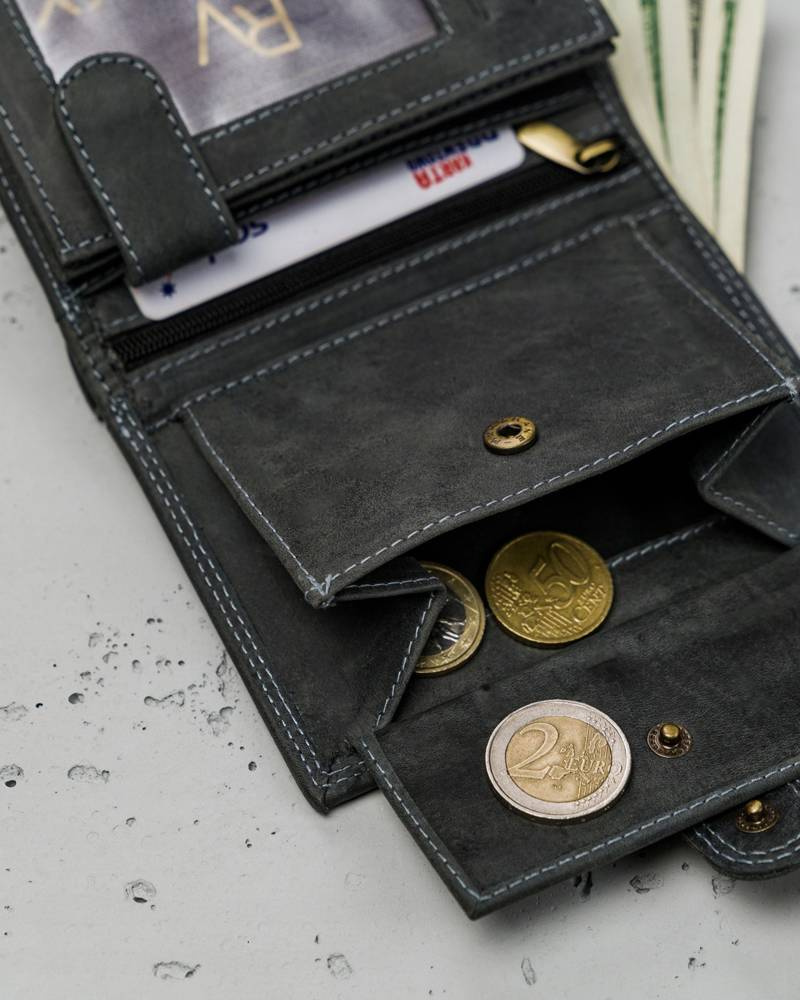 W kieszeniach na banknoty i monety zmieścisz satysfakcjonującą ilość gotówki.