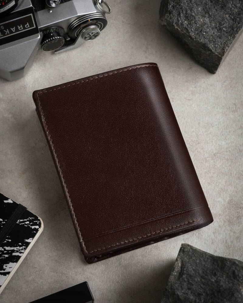 • Pionowy portfel męski bez zewnętrznego zapięcia. Wykonany z jednolitej skóry naturalnej bardzo dobrej jakości. Akcesorium z wieloma zakładkami na karty, kieszenią na dowód rejestracyjny i zabezpieczeniem antykradzieżowym RFID Stop. Zapakowane w pudełko.