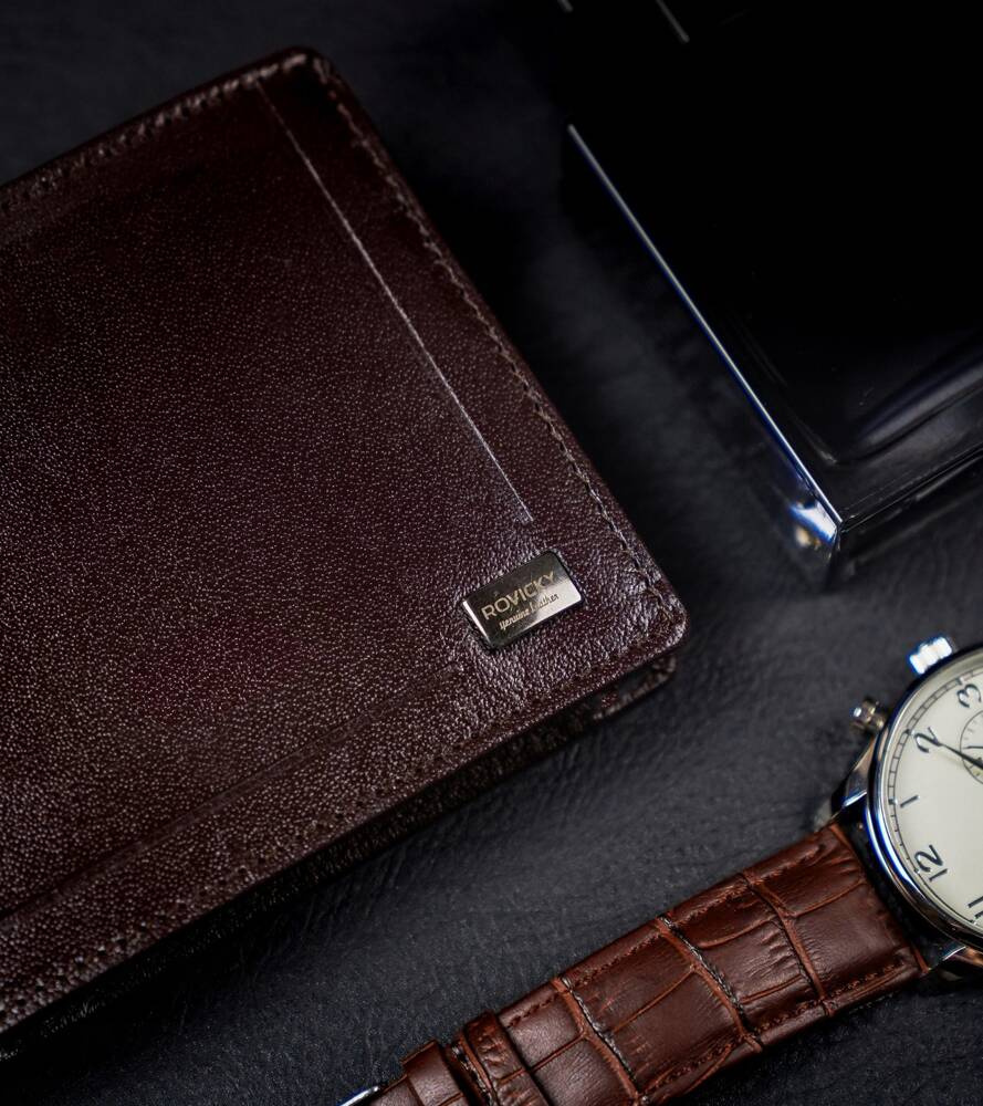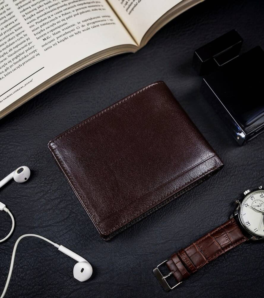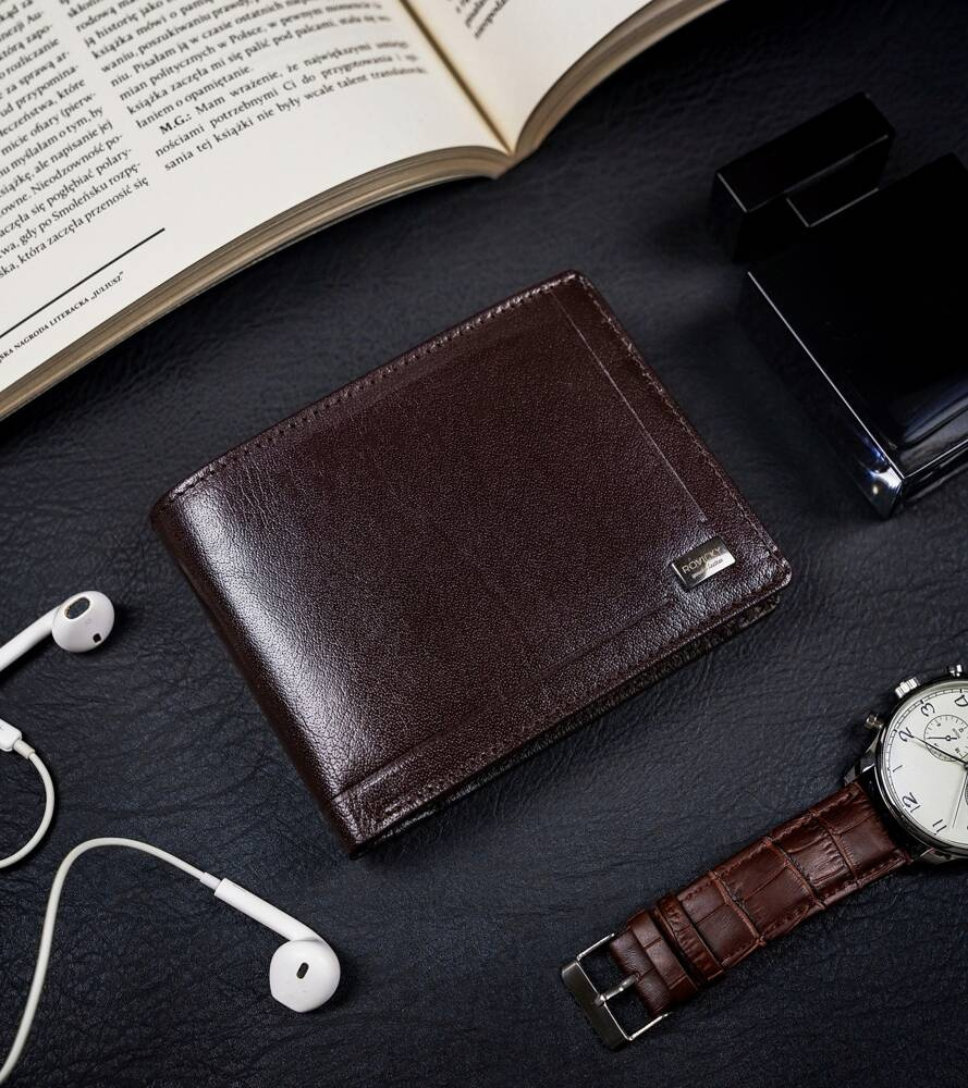 - Portfel odszyty z naturalnej skóry bydlęcej licowej w zawsze modnym i klasycznym brązowym kolorze;