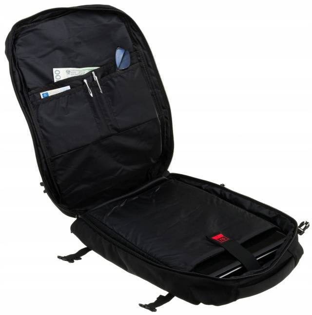 Plecak jest niezwykle funkcjonalny, ma mnóstwo kieszeni i skrytek. Jest jednokomorowy, ogółem posiada 5 kieszonek. Jedna z nich dedykowana jest na laptopa 15". Oprócz tego organizer, w którym znajdują się 2 przegrody na długopis. Wszystko to czyni plecak idealnym do pracy.