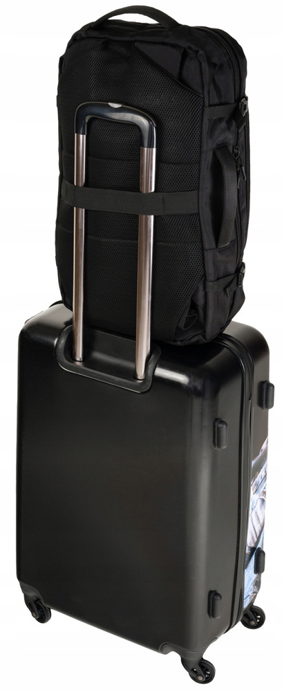 - Tylna ścianka plecaka ma świetny ergonomiczny kształt i wyłożona została siatką dystansową o właściwościach oddychających. Oprócz tego, w tej części zainstalowany jest specjalny uchwyt, który odpowiada za mocowanie do walizki. Idealny na podróż.