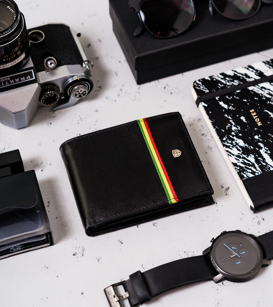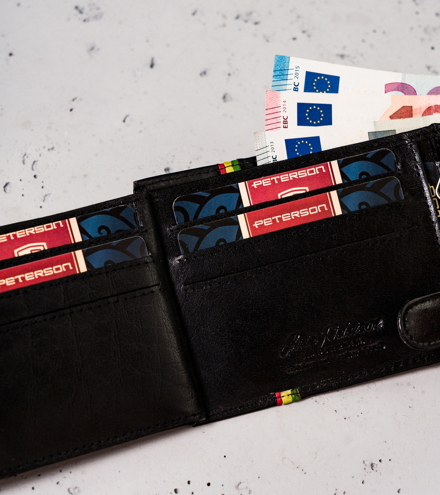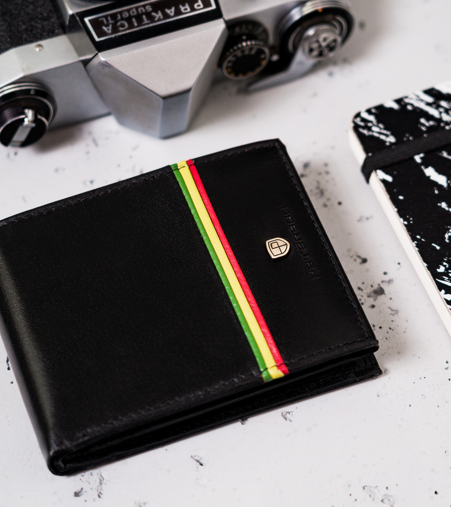 - Idealny upominek | Portfel o klasycznym fasonie bez zapięcia zewnętrznego. Ozdobiony paskiem w barwach symbolizujących ruch Rastafari
