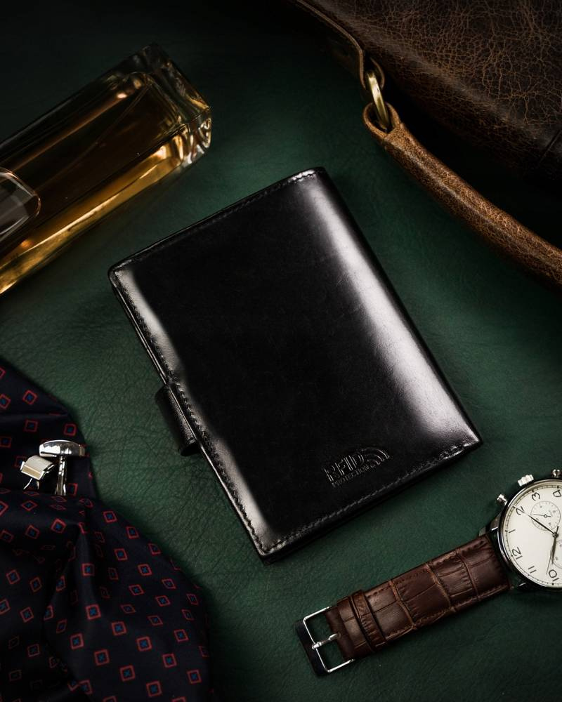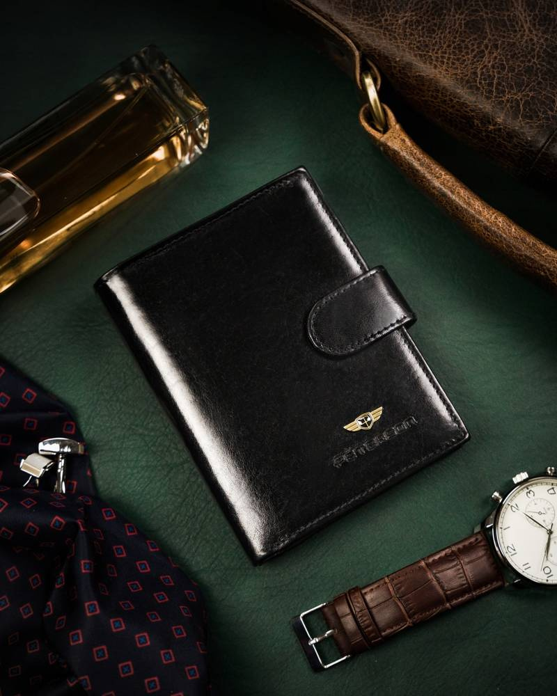 • Odszyty ze skóry naturalnej świetnego gatunku. Portfel w głębokim, czarnym kolorze. Jego ponadczasowy design sprawia, że będzie świetnym wyborem dla Panów w każdym wieku. Wyposażony w technologię RFID BLOCKING SYSTEM.