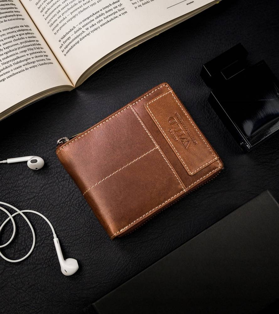 Oferujemy najwyższej jakości portfel męski ze skóry naturalnej o dużej wielkości, który: