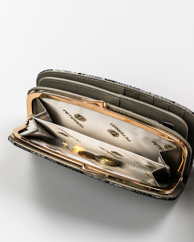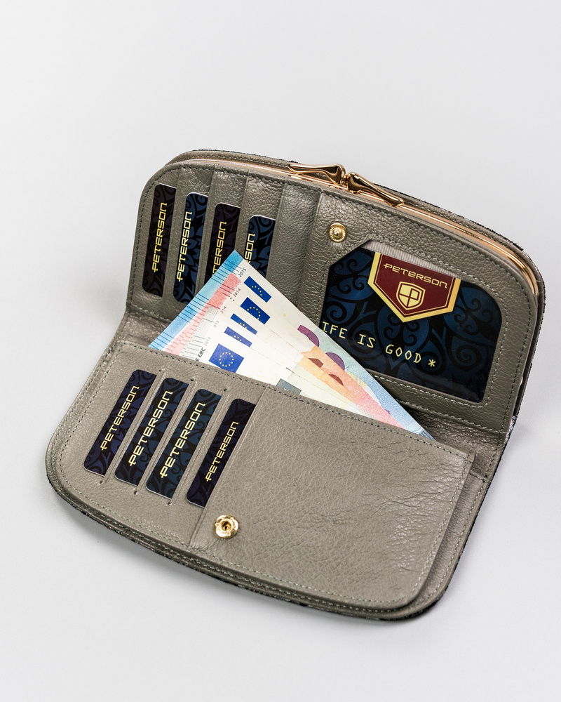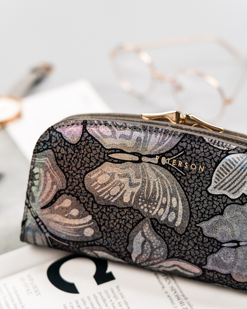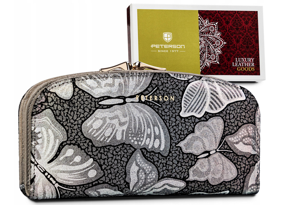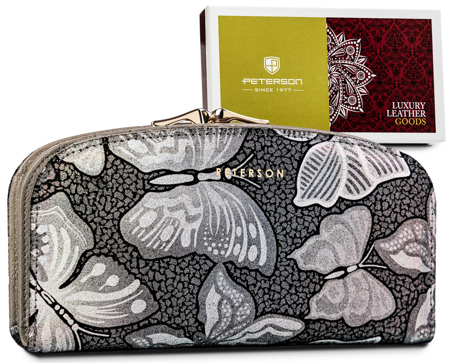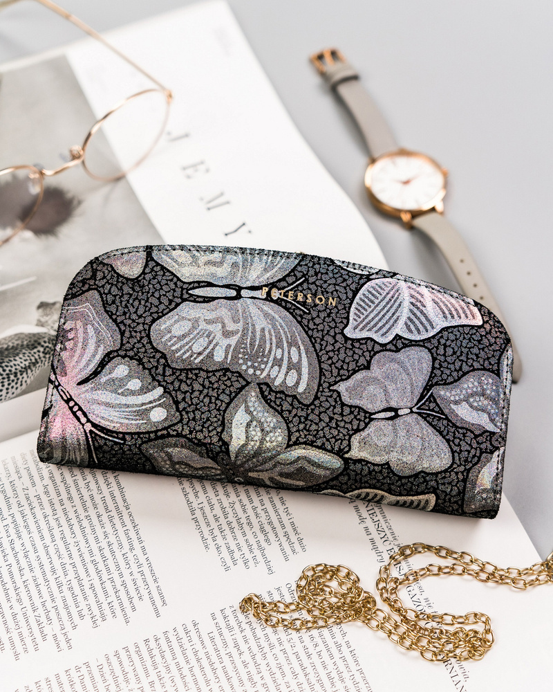 Skórzany portfel damski zdobiony holograficznymi motylami — Peterson