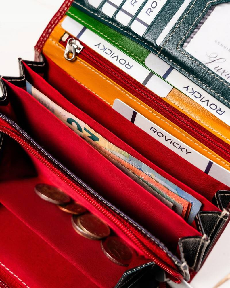 - 4 kieszonki na dokumenty w większym formacie, jak dowód rejestracyjny w okładce. Jedna z tych kieszonek mieści się po zewnętrznej części, z tyłu portfela i jest otwarta. Zalecamy jednak, by ważne dokumenty przechowywać wewnątrz, zamykanego napą portfela;