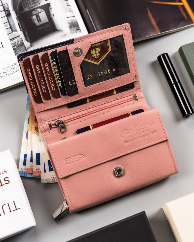 W wyposażeniu portfela:- 5 przegródek dedykowanych na karty, wizytówki lub dokumenty;