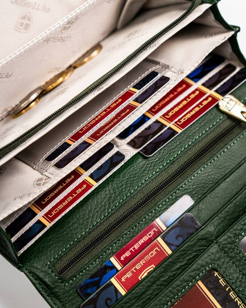 - 1 kieszonkę w centralnej części portfela, zapinaną na suwak;