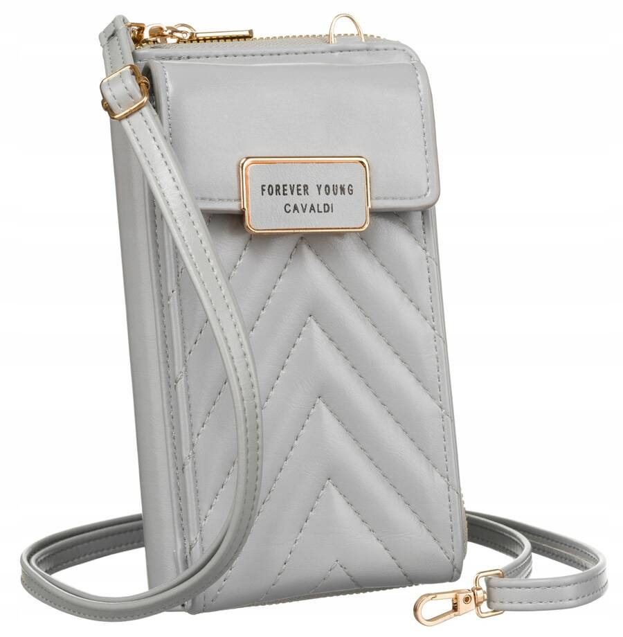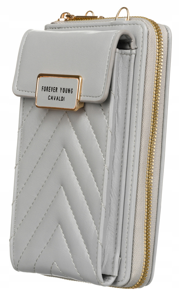 • Torebko-portfel w fasonie piórnika zapinany na zamek. Na froncie kieszonka na telefon zapinana klapką na zatrzask magnetyczny. Wewnątrz 4 miejsca na karty i 1 kieszonka na suwak. Posiada odpinany, regulowany pasek. Elegancki, pikowany panel na froncie.