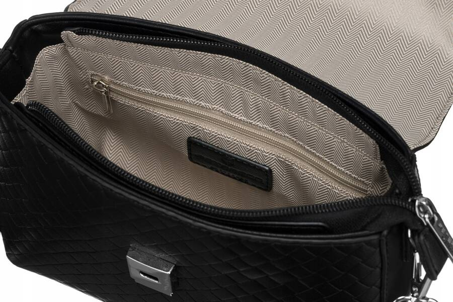 • Modny design | Torebka zamykana klapką na zatrzask. Klapa posiada gładką fakturę, a na froncie wytłoczono wzór imitujący sploty. Wszystkie okucia w torebce mają piękny srebrny kolor;