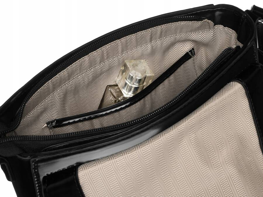 Torebka posiada 1 komorę, w której zlokalizowane są 2 dodatkowe kieszonki. Bez problemu pomieszczą one drobne przedmioty takie jak telefon, dokumenty czy kosmetyki. Jedna jest otwarta, druga jest zamykana na suwaczek.