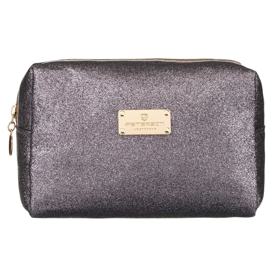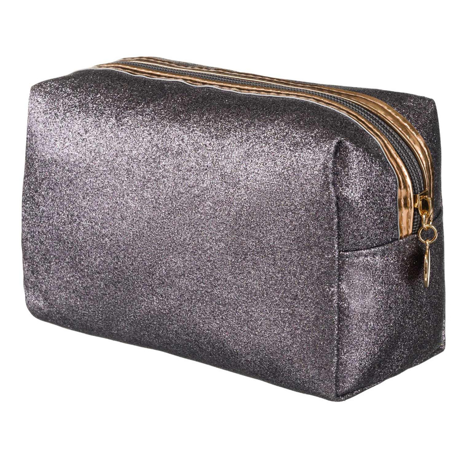 Elegancka kosmetyczka wykonana z materiału ozdobionego drobnym brokatem w kolorze czarnym. Wykończenie w kolorze różowego złota nadaje ekskluzywny charakter. Zapięcie suwaka ozdobione okrągłą, metalową przywieszką.