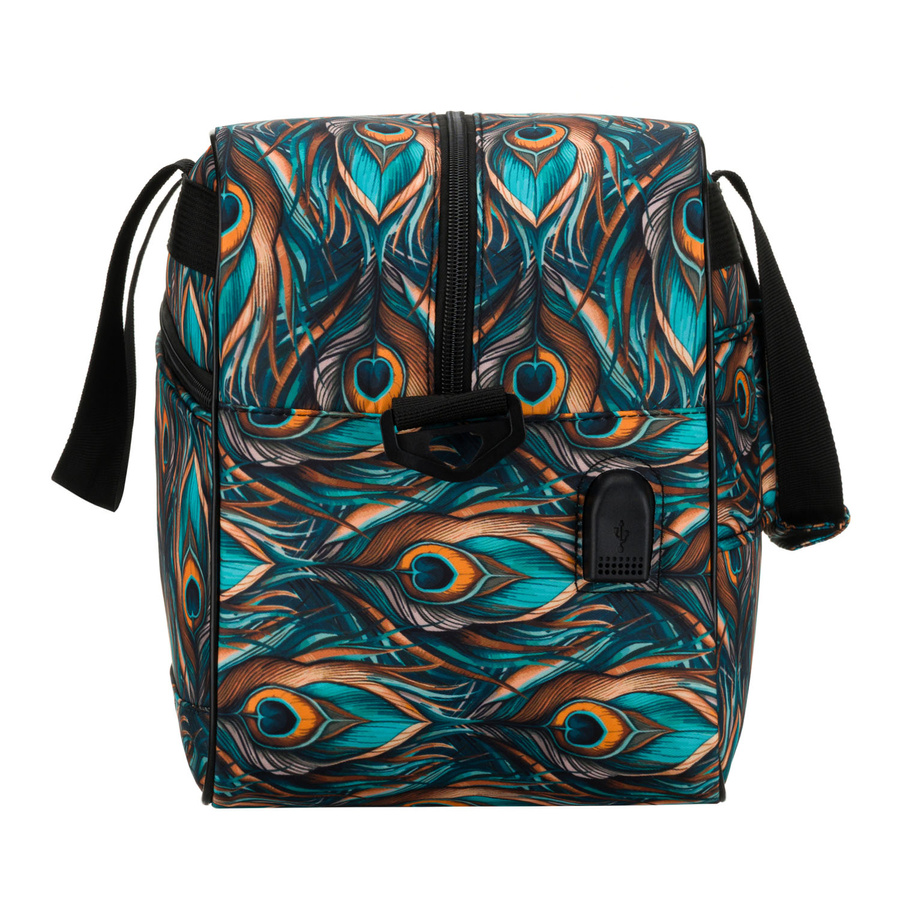 Na zewnątrz torby znajduje się port USB. Wystarczy podłączyć kabel USB znajdujący się w torbie do swojego powerbanku i mamy prąd w porcie USB.
