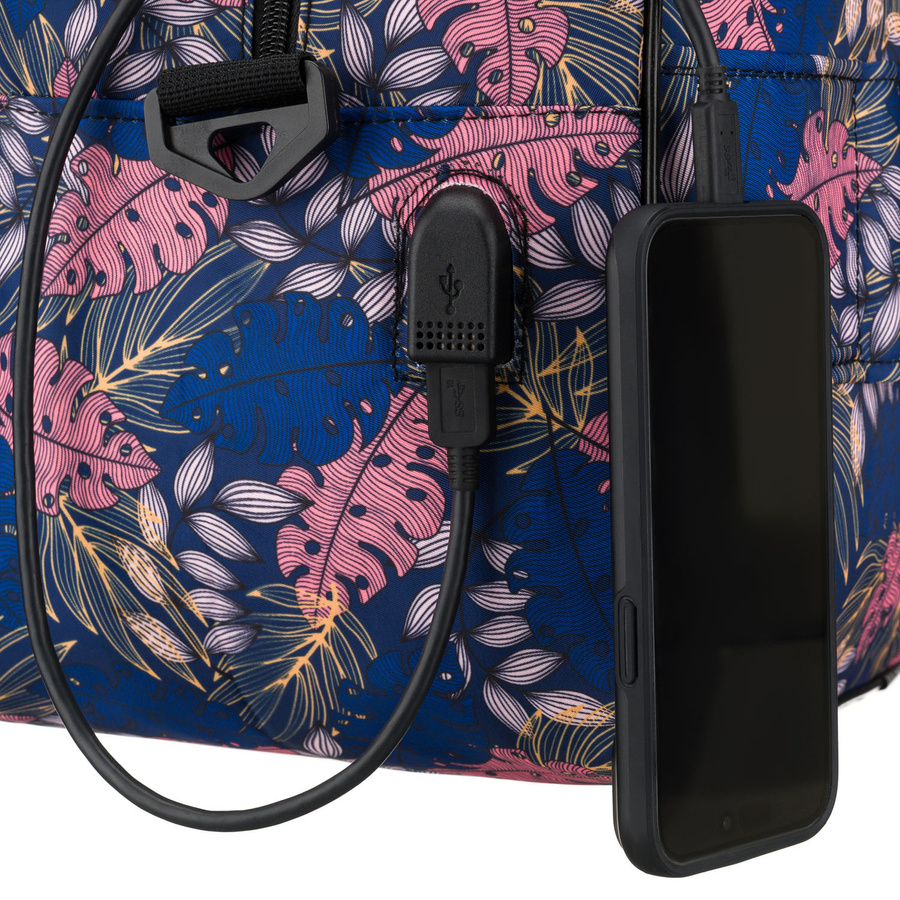 Na zewnątrz torby znajduje się port USB. Wystarczy podłączyć kabel USB znajdujący się w torbie do swojego powerbanku i mamy prąd w porcie USB.