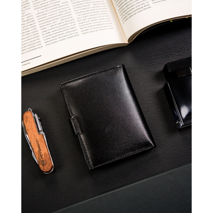 • Czarny portfel męski ze skóry naturalnej. Model mieści dowód rejestracyjny i został wyposażony w system RFID. Posiada 9 przegródek na karty. Portfel zamykany na zatrzask.