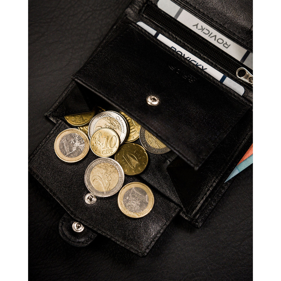 • Funkcjonalność portfela uzupełnia pojemna kieszeń na bilon, zapinana na klasyczny zatrzask – nie wysypie się z niej nawet najmniejsza moneta.