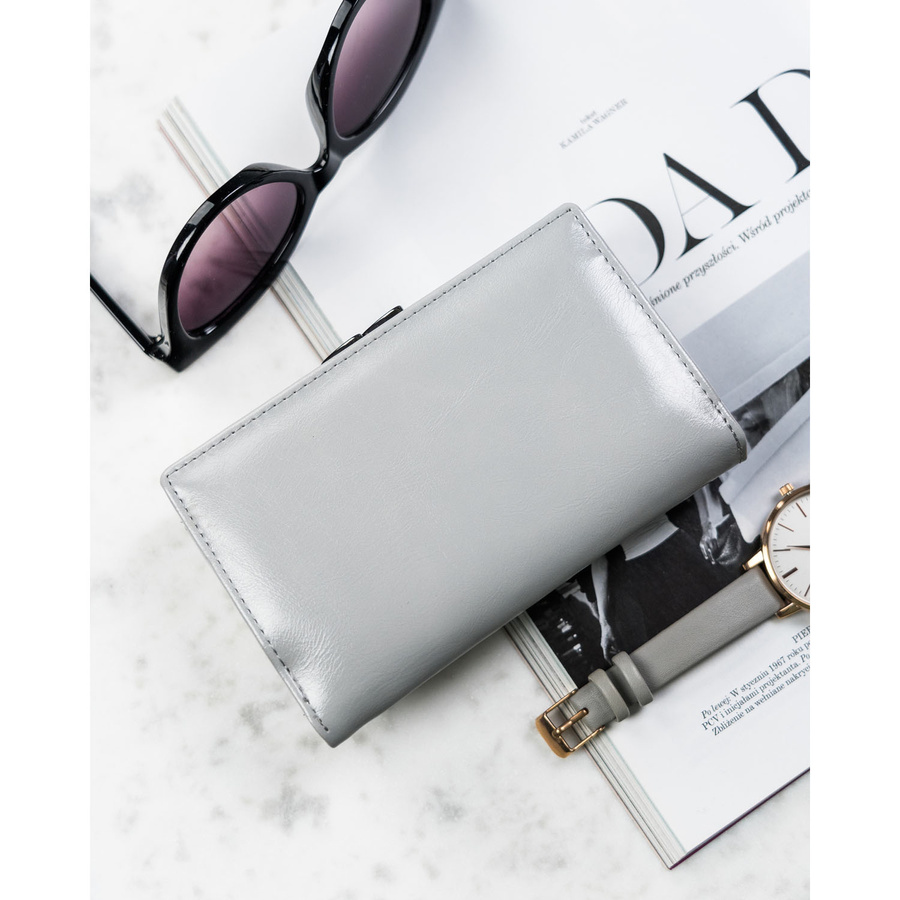 - Klasyczny portfel z biglem | Skóra portfela po stronie zewnętrznej jest lakierowana, pięknie się błyszczy i ozdobiona została tłoczeniem imitującym kwiatki.