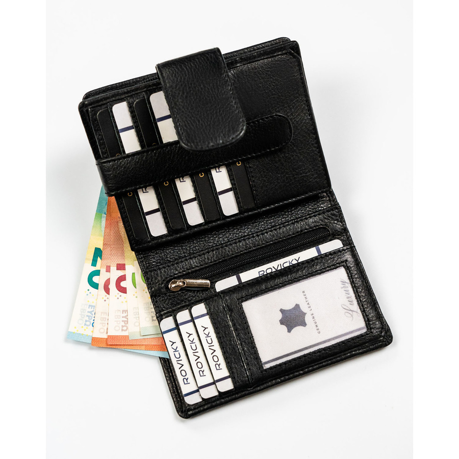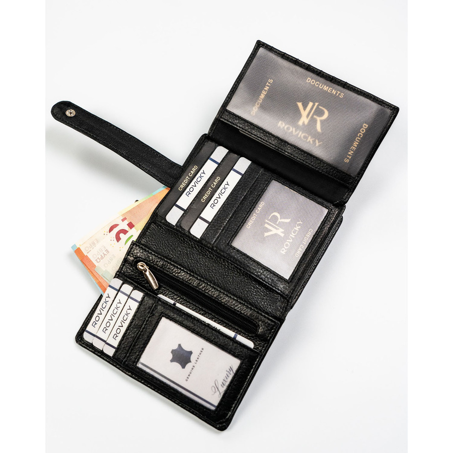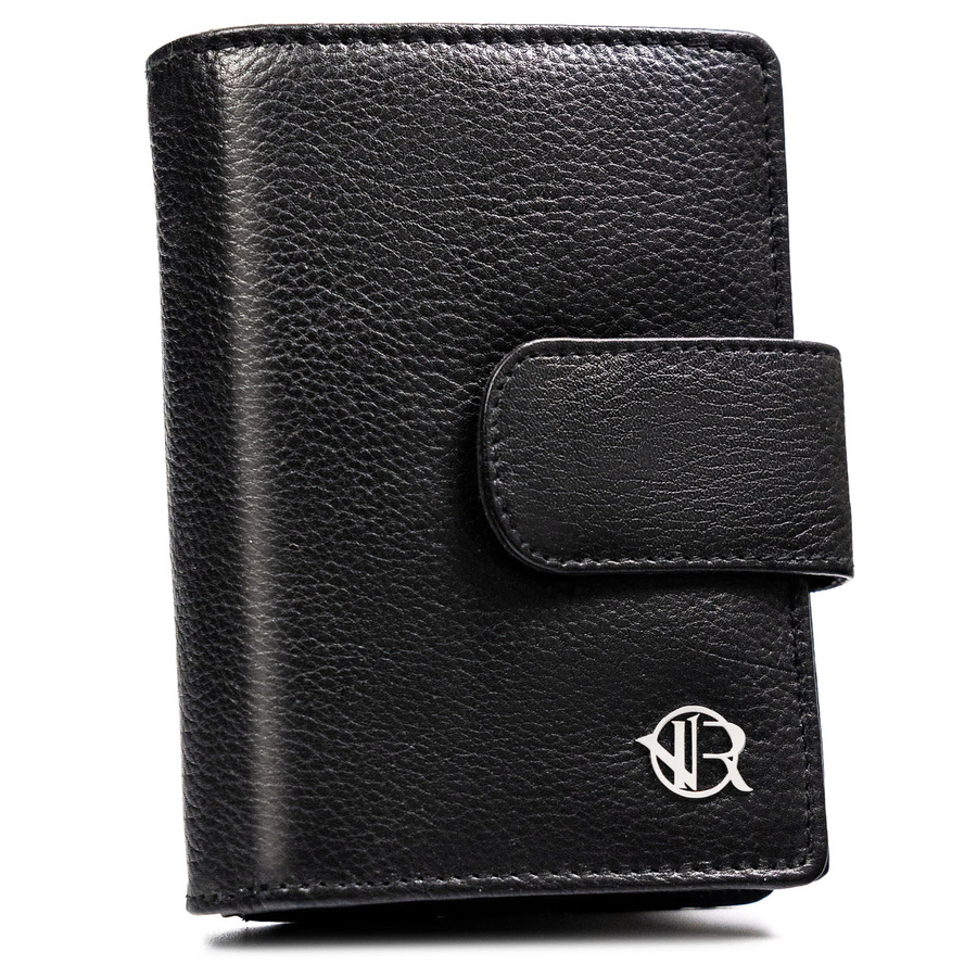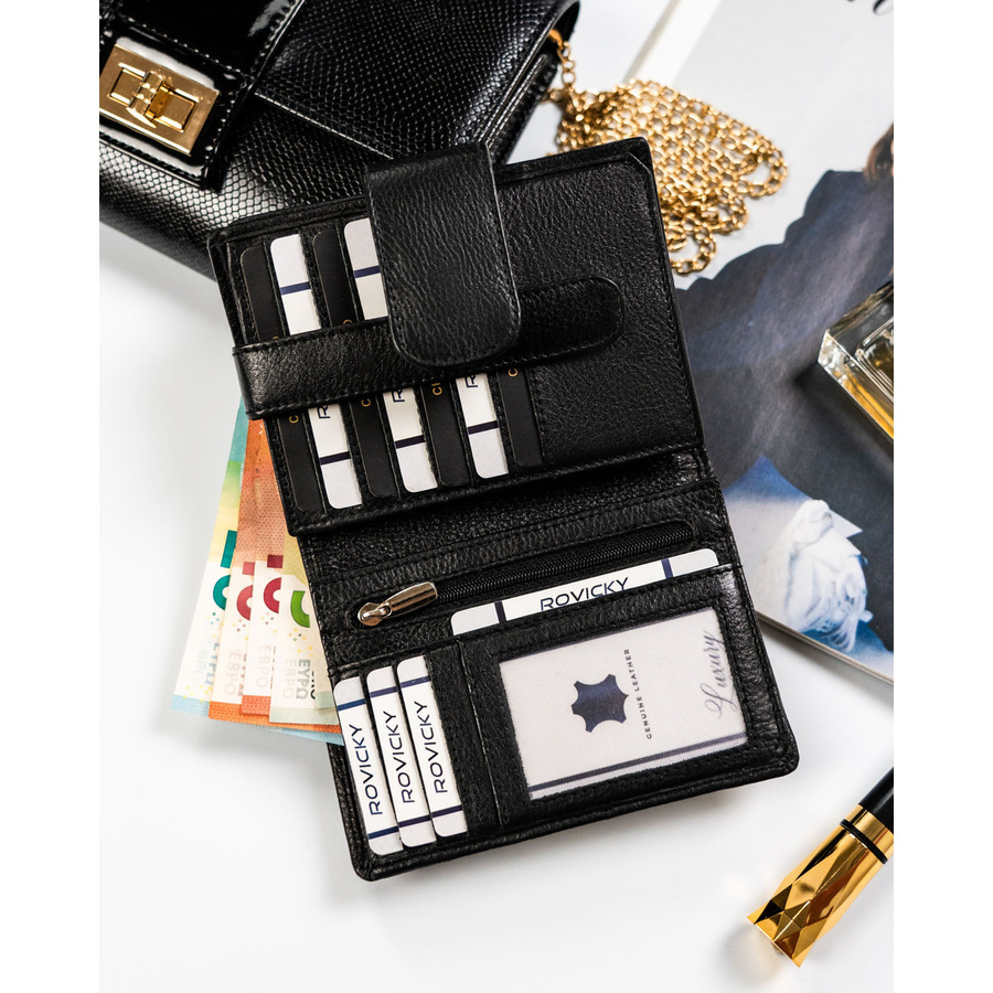 Czarny, skórzany portfel damski w orientacji pionowej zamykany na zatrzask - Rovicky