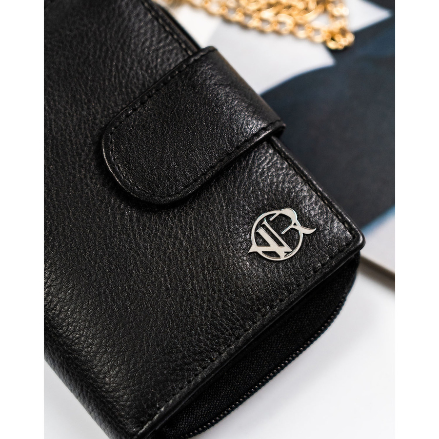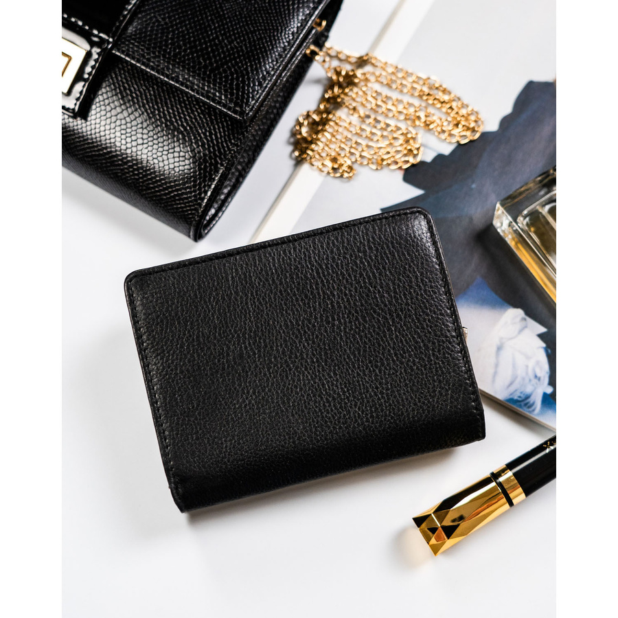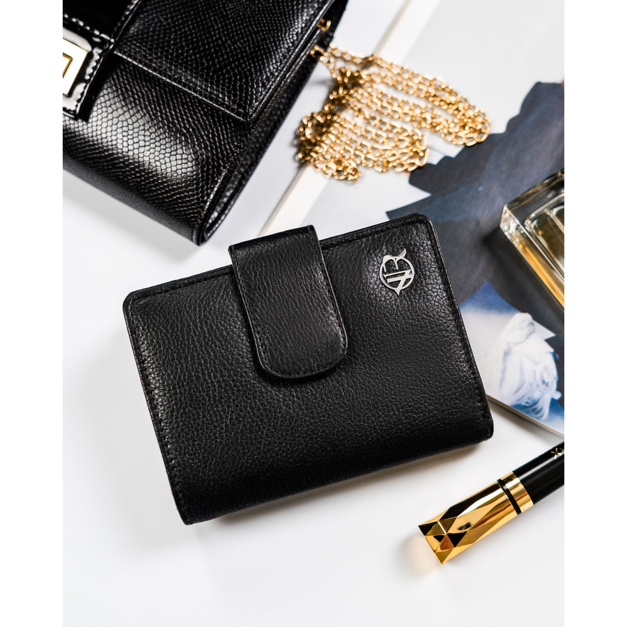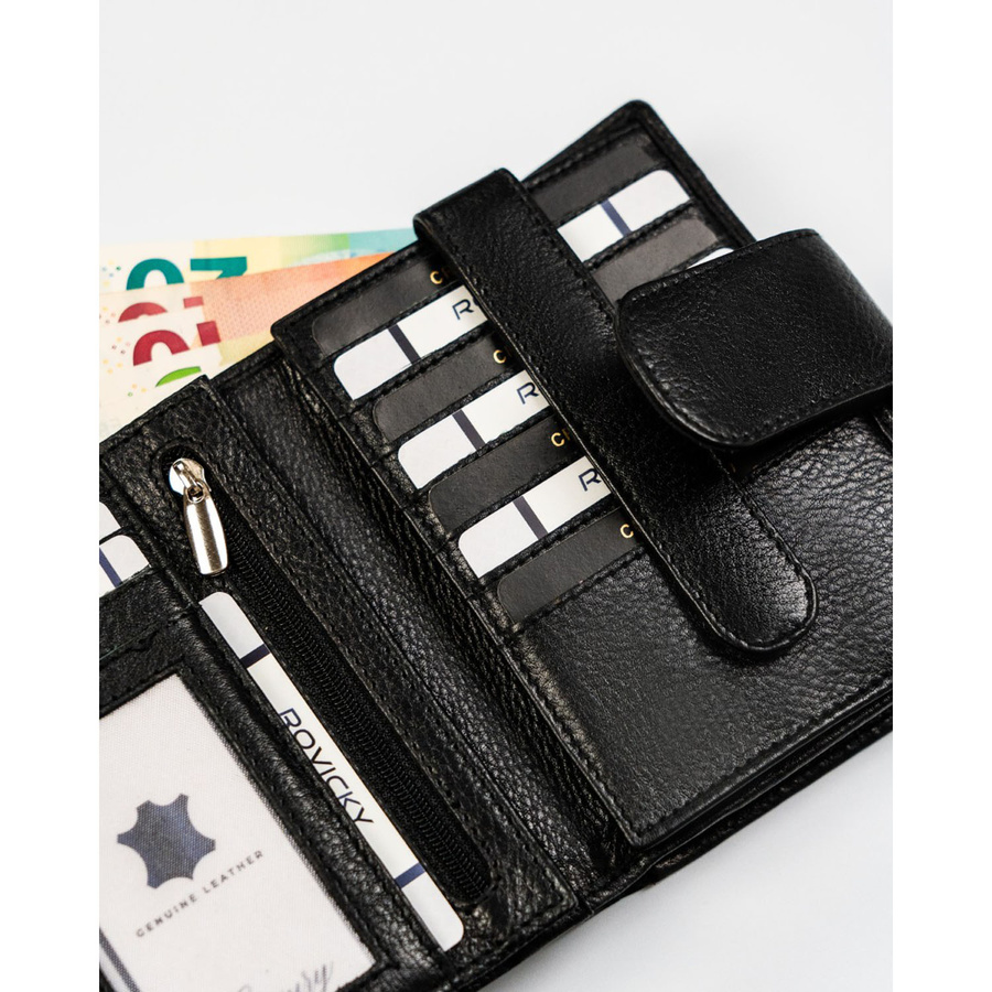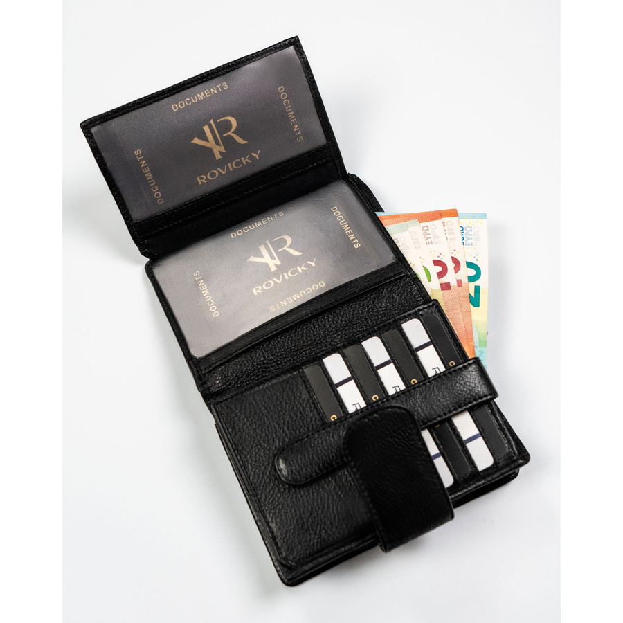 Czarny, skórzany portfel damski w orientacji pionowej zamykany na zatrzask - Rovicky