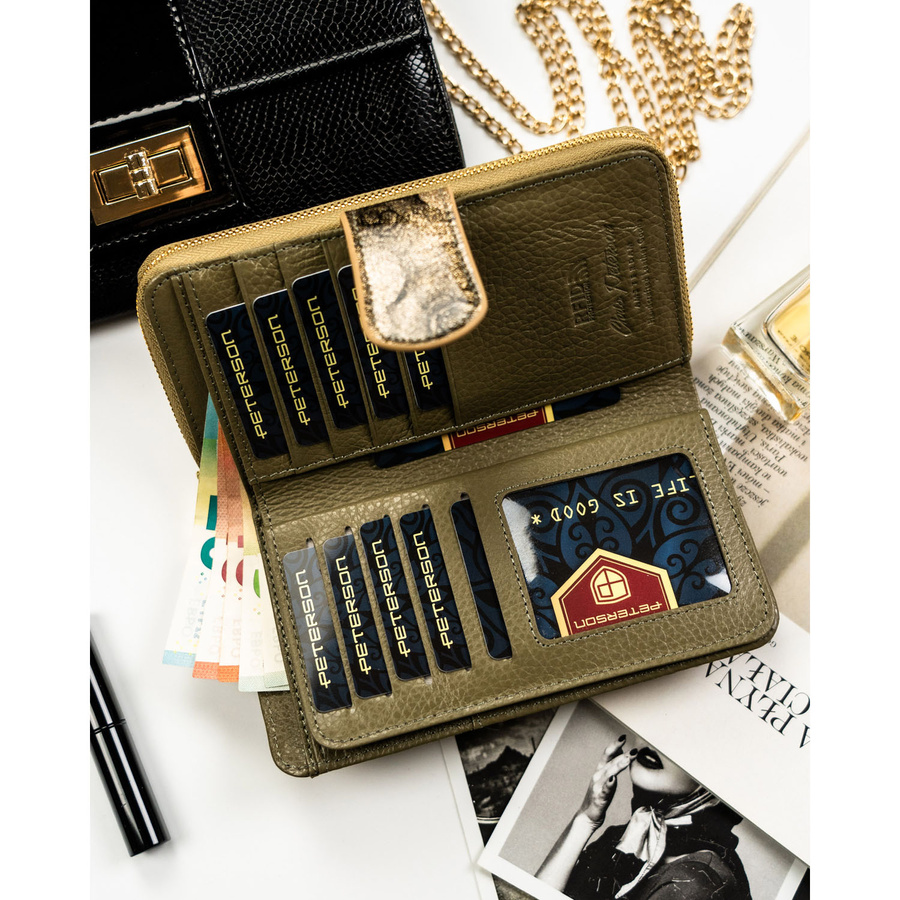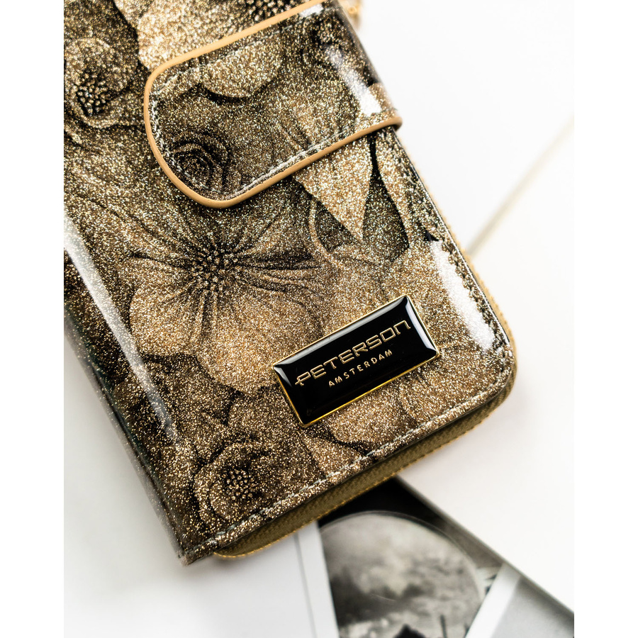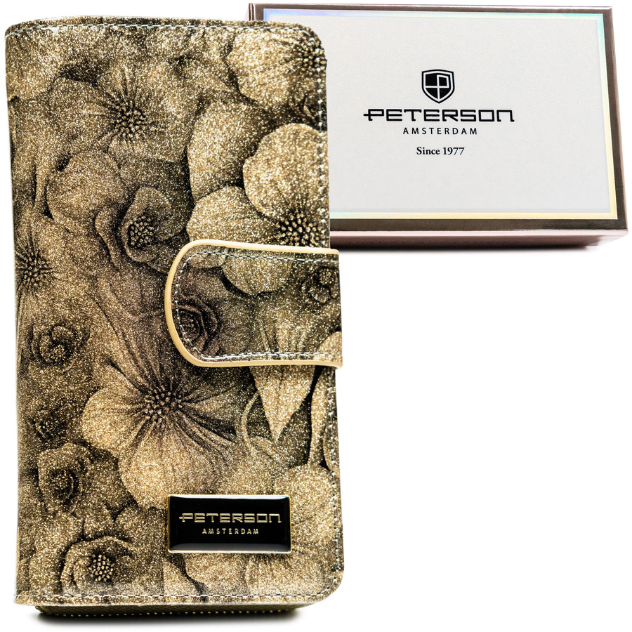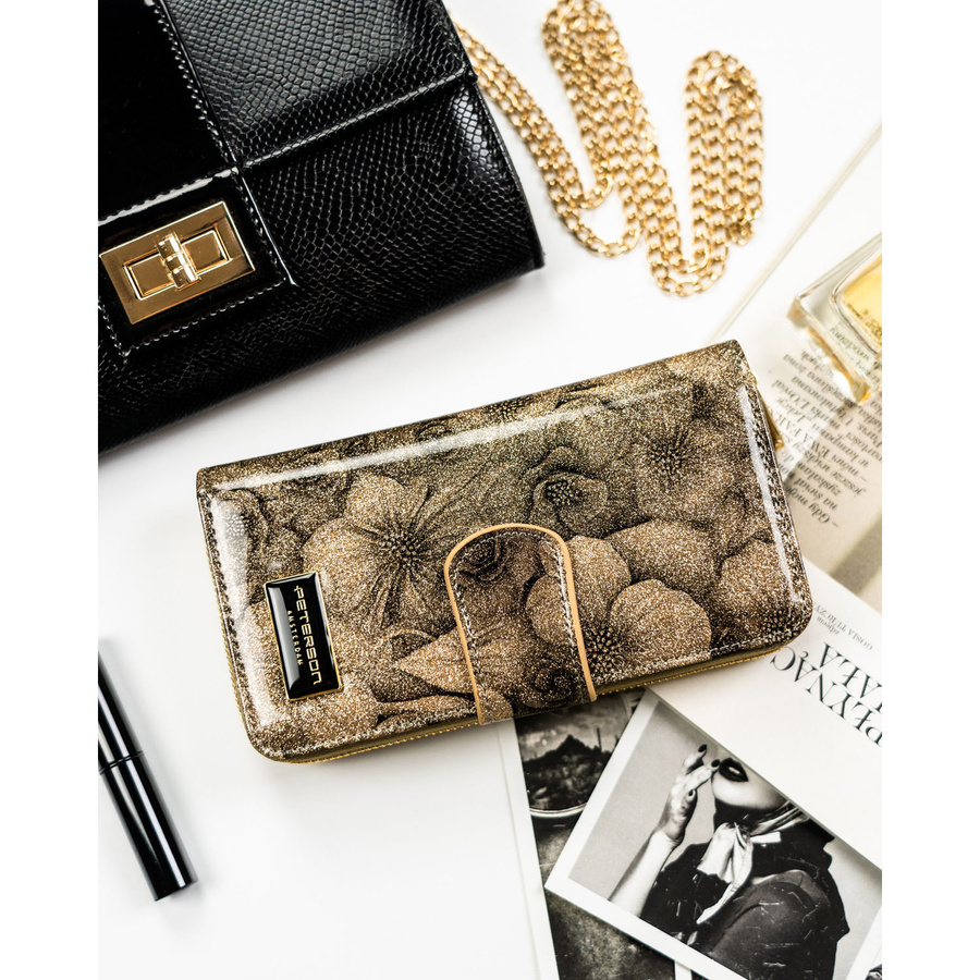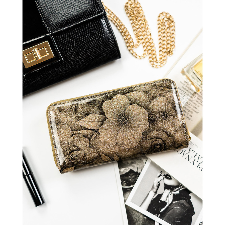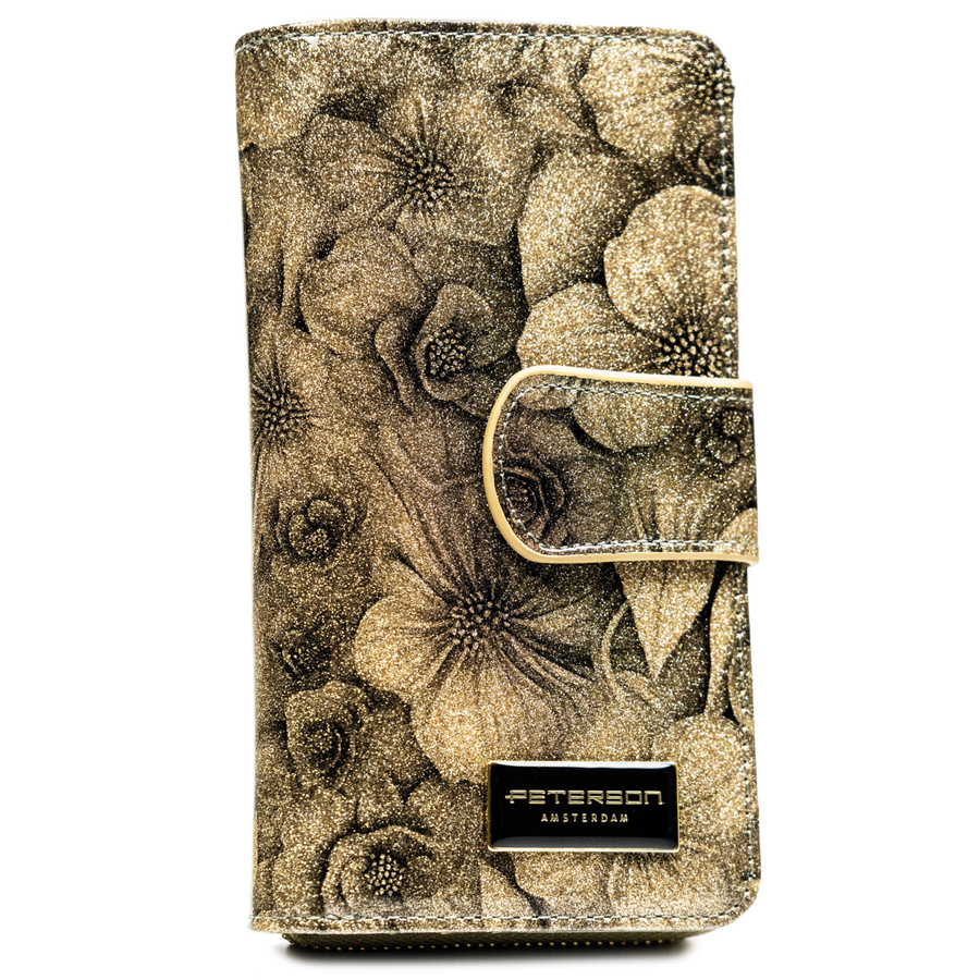Złoty, lakierowany, duży portfel damski z kwiatowym wzorem Peterson