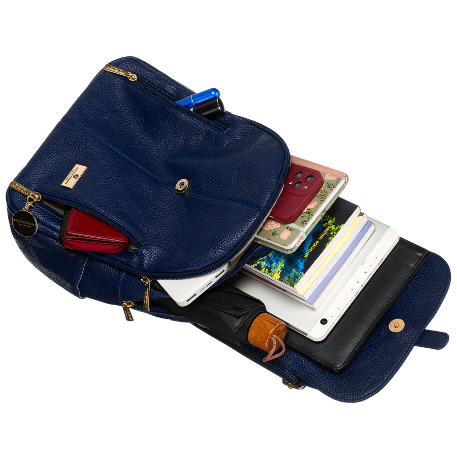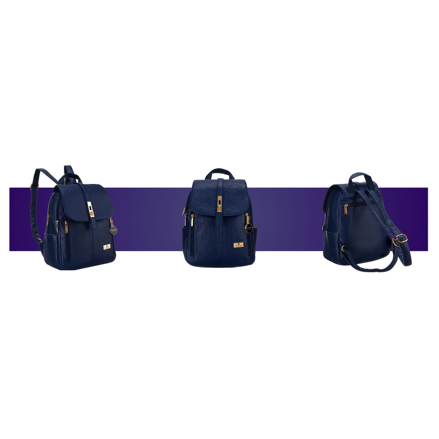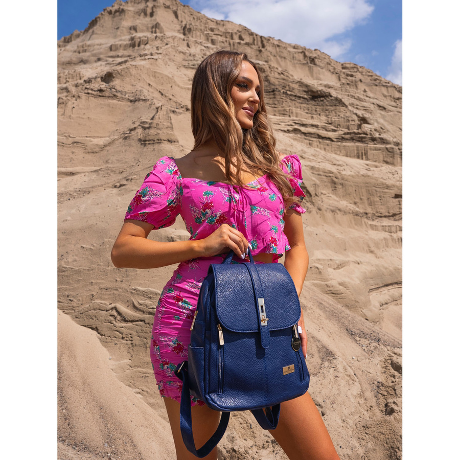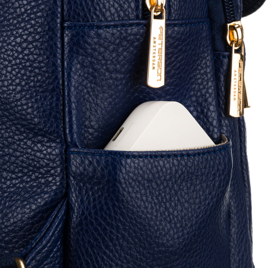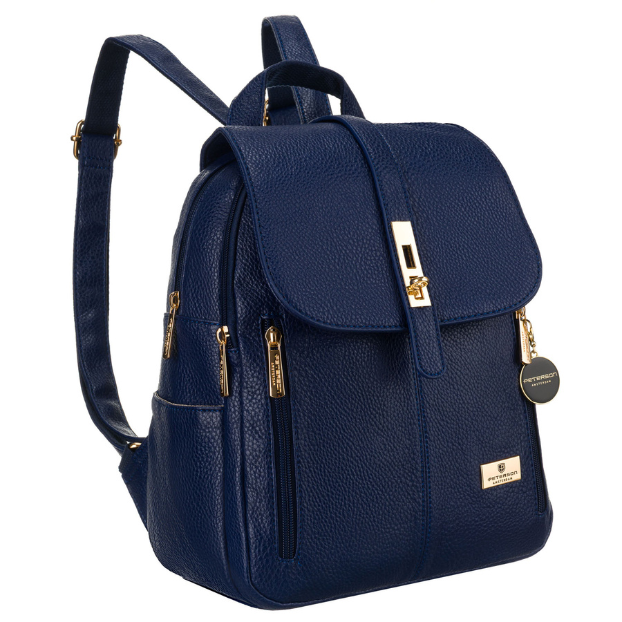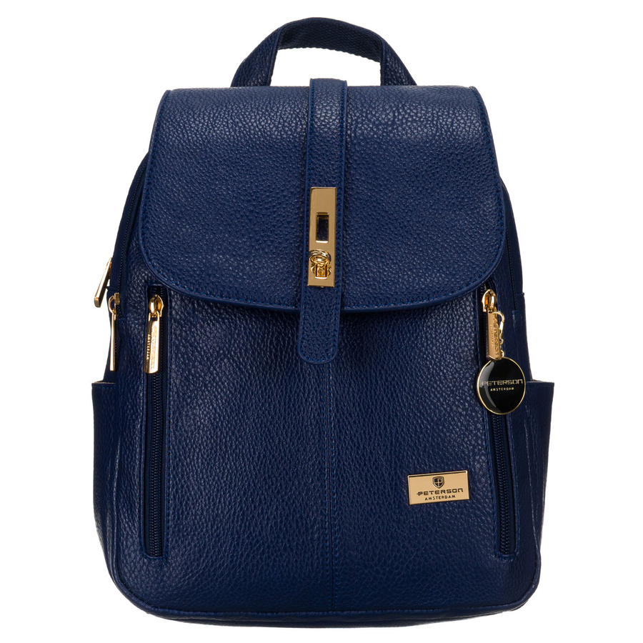 Modny granatowy plecak damski z klapką zdobiony złotymi okuciami skóra ekologiczna Peterson