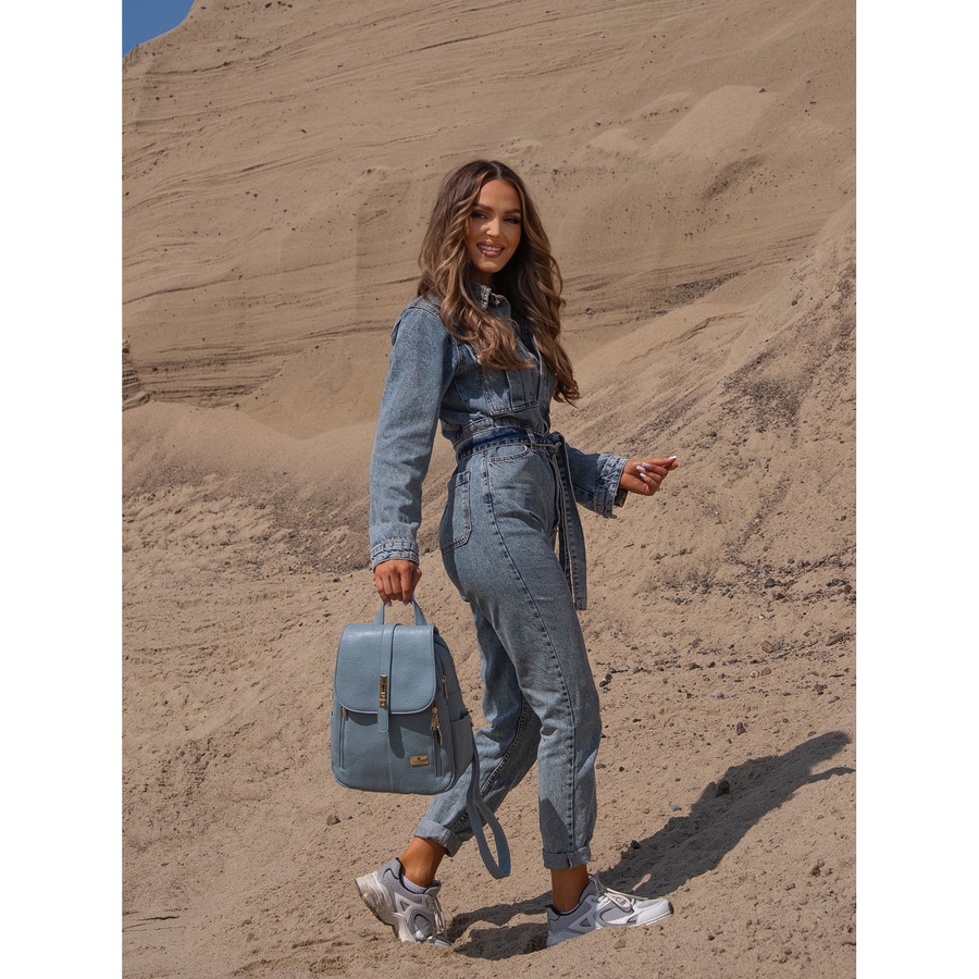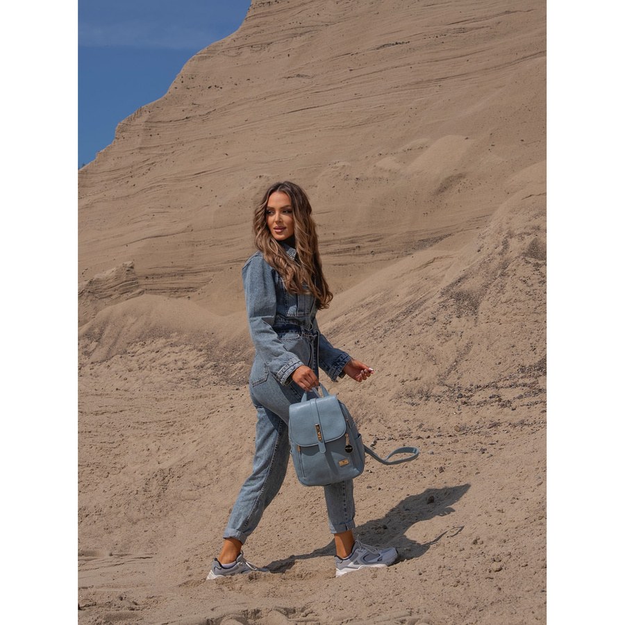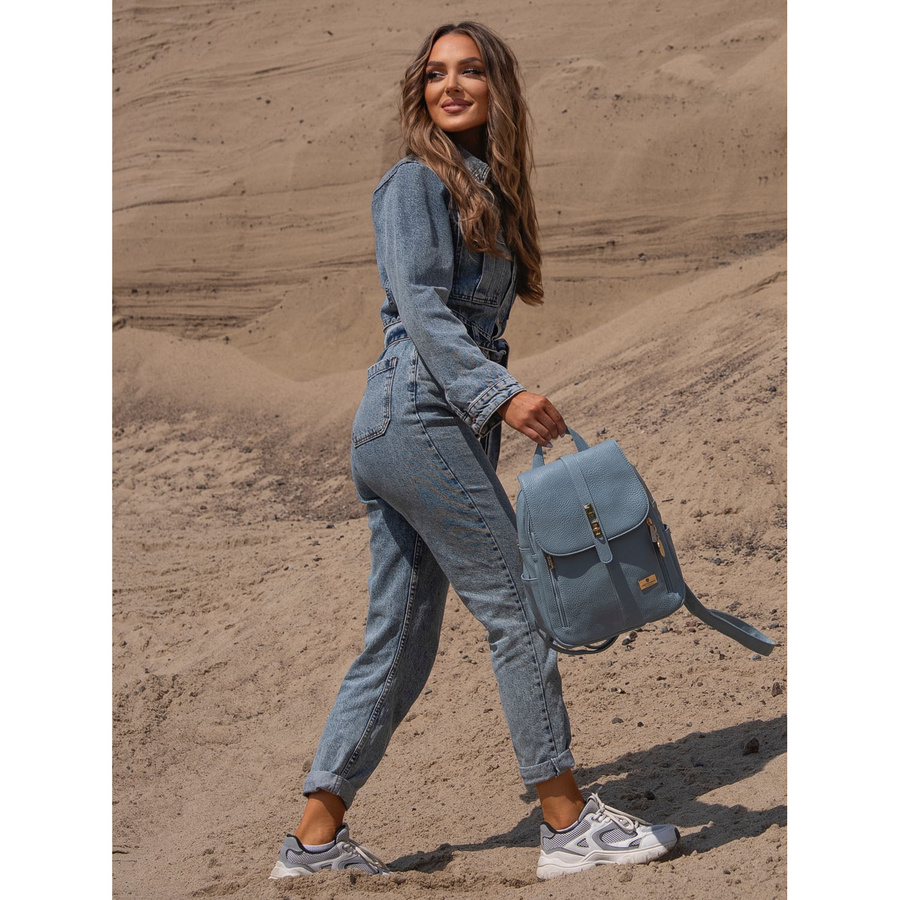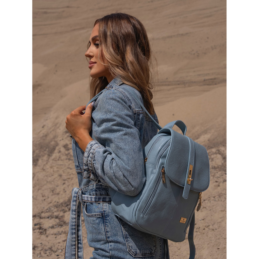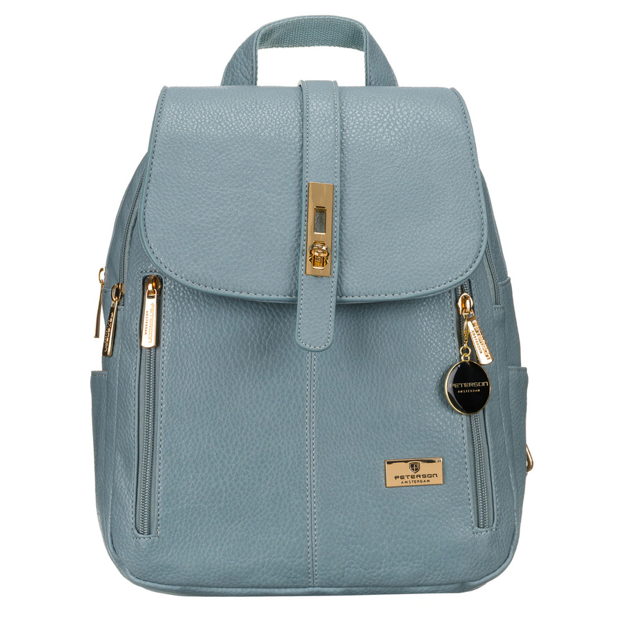 Modny niebieski mały plecak damski ze skóry ekologicznej zdobionej złotymi okuciami Peterson