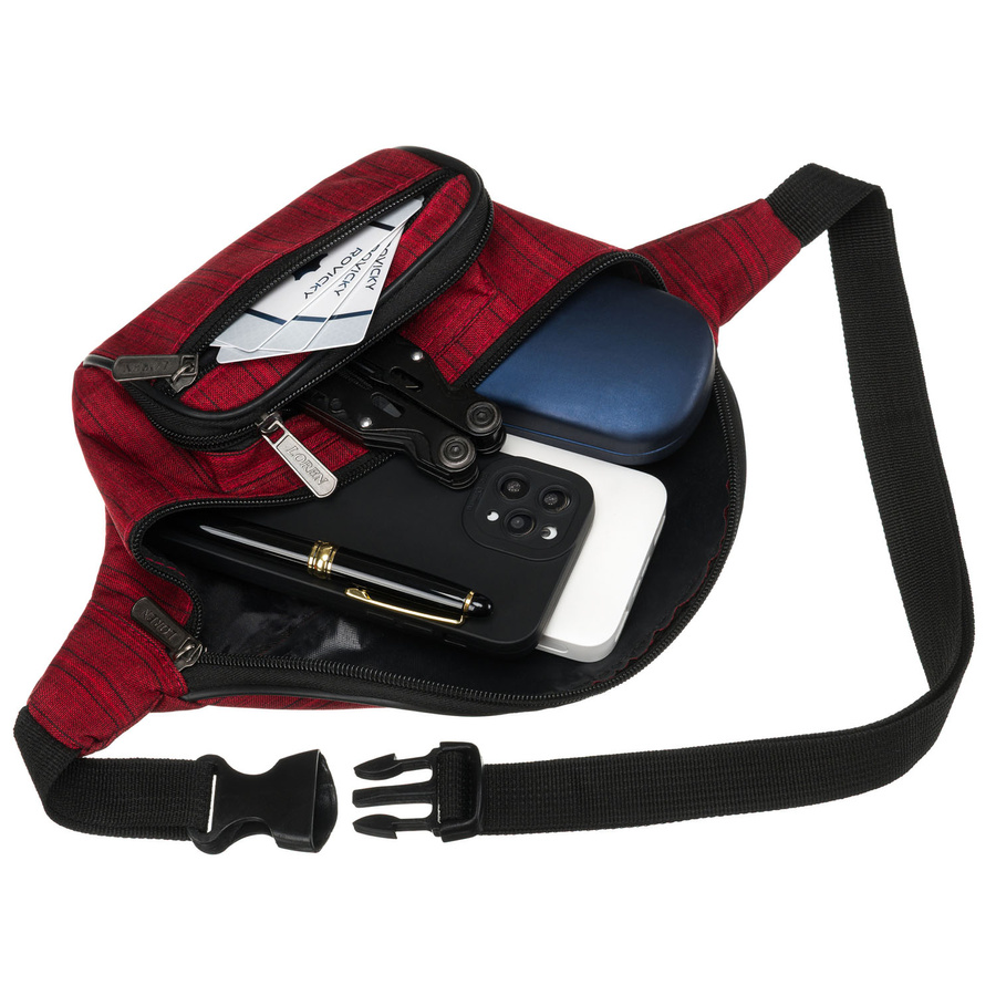 • Idealna nerka na wycieczki wykonana z poliestru w czerwonym kolorze. Kompaktowa, ale pojemna – posiada 3 kieszenie na drobiazgi. Zawieszona na regulowanym pasku. Zamykana suwakami.