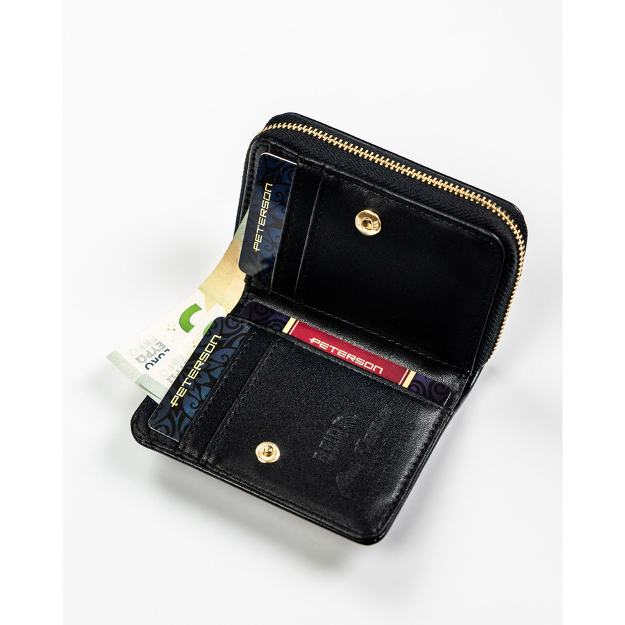 Mały portfel damski ze skóry ekologicznej w czarnym kolorze zamykany na suwak i zatrzask - Peterson