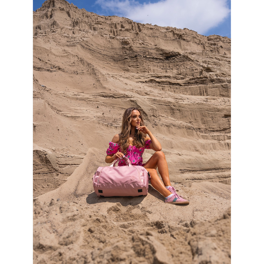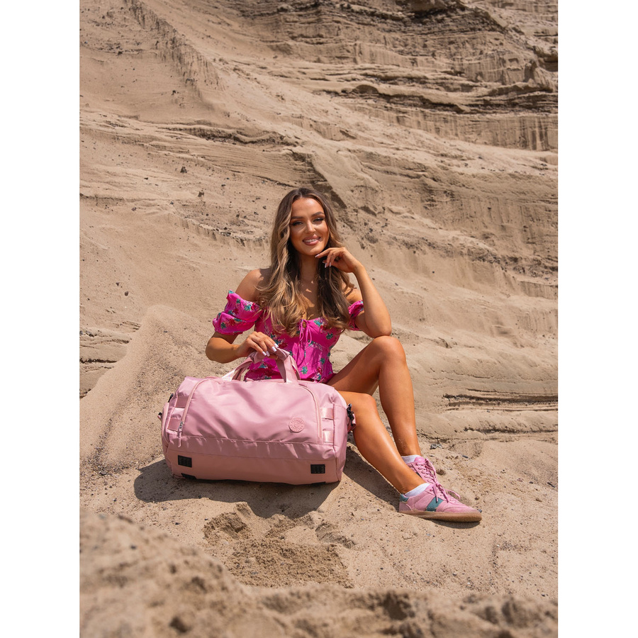 • Torba podróżna lub na siłownię wykonana z poliestru w różowym kolorze. Wyposażona w wygodny, regulowany pasek o długości do 120 cm. Posiada praktyczną komorę boczną na buty, kieszeń zewnętrzną i uchwyt do zaczepienia na walizce.