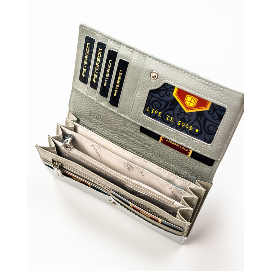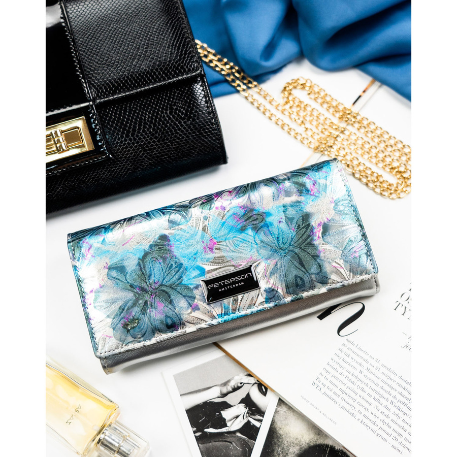 Wielokolorowy, duży portfel damski ze skóry ekologicznej i naturalnej zamykany zatrzaskiem - Peterson