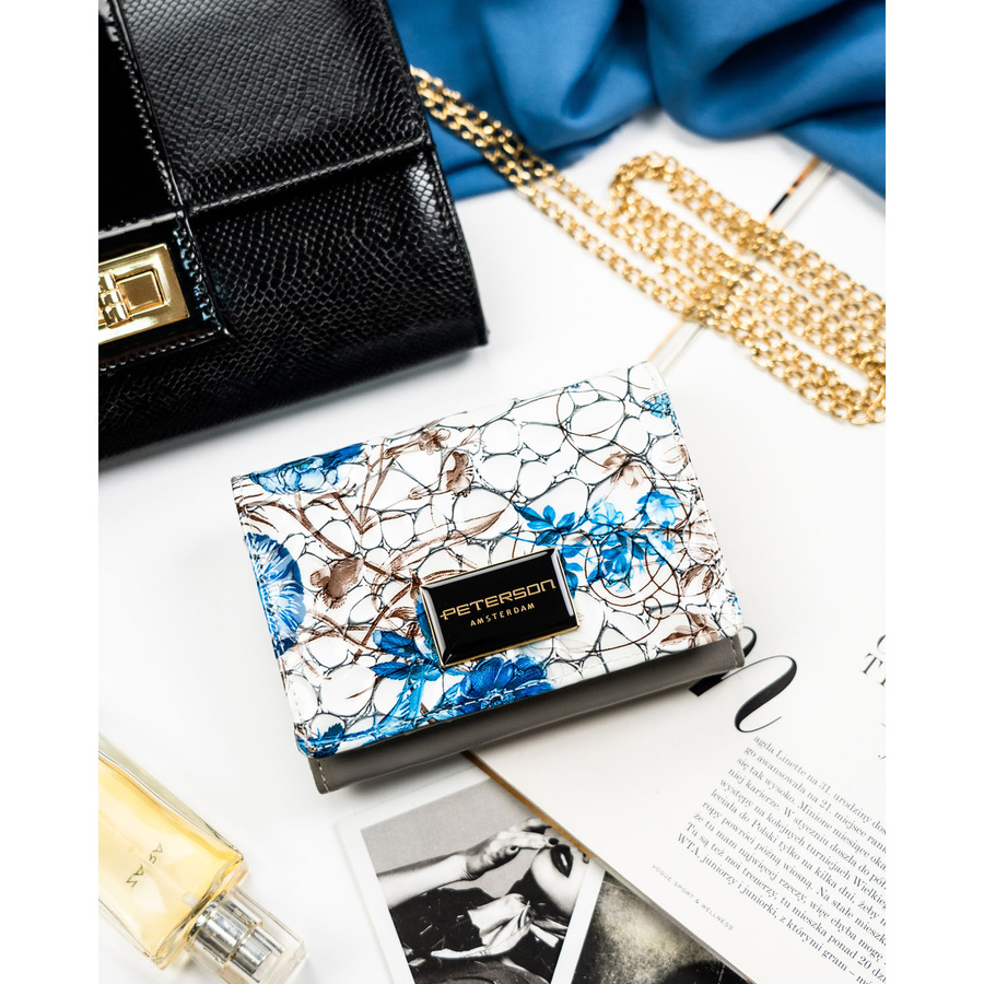 Portfel damski ze skóry naturalnej w niebieskim kolorze ozdobiony kwiatowym wzorem - Peterson