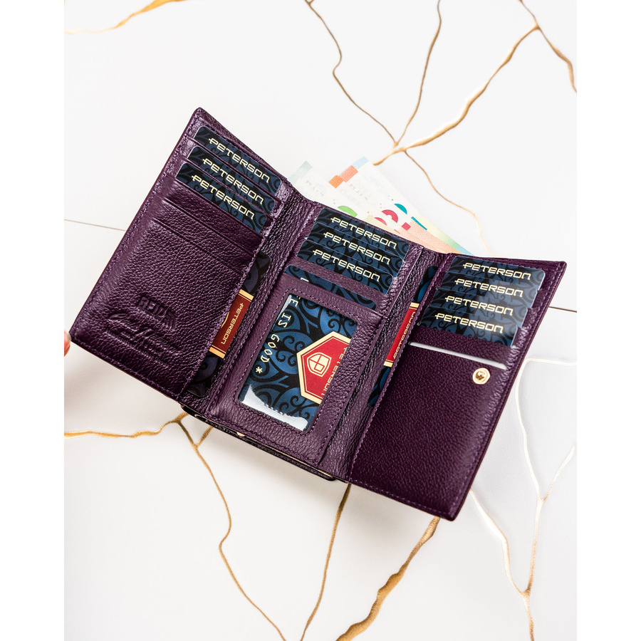 Fioletowy portfel damski wykonany ze skóry naturalnej i ekologicznej zamykany zatrzaskiem i biglem - Peterson