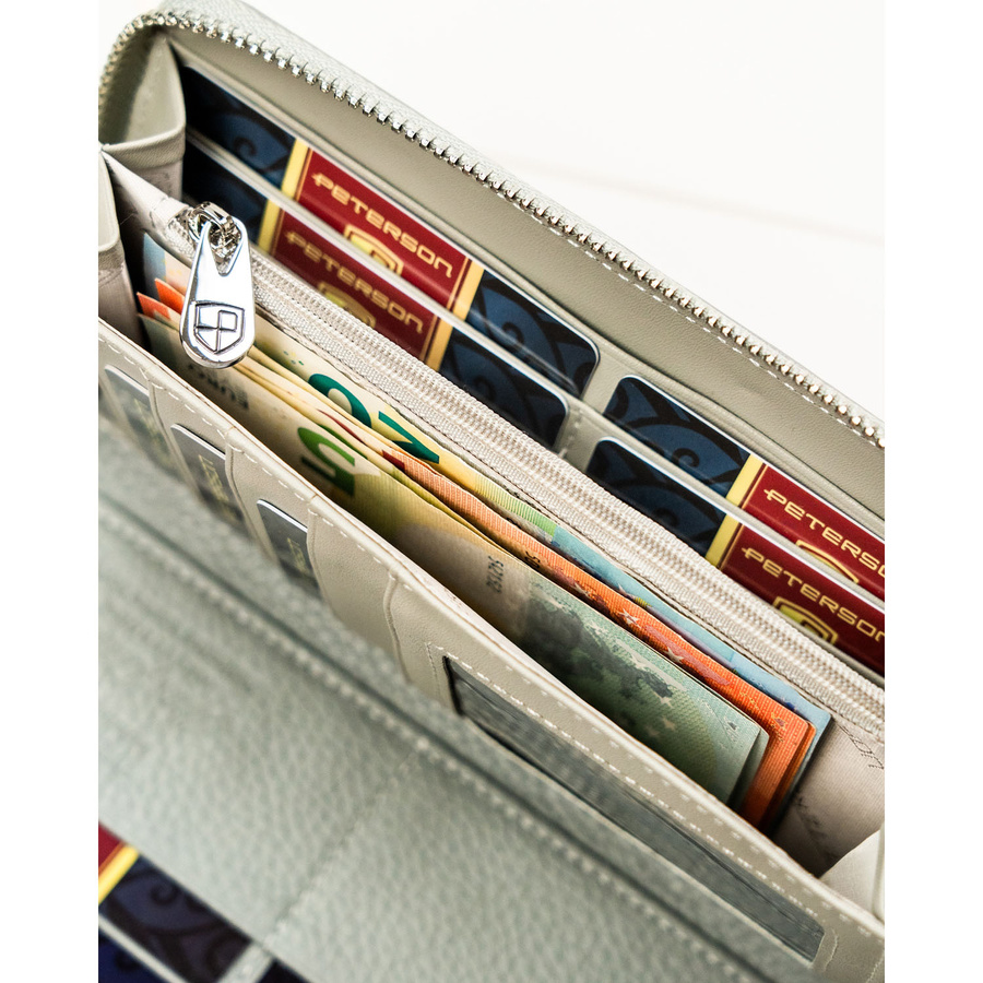 • Portfel w szarym kolorze. Wykonany ze skóry naturalnej i ekologicznej. Ma aż 13 miejsc na karty, oddzielne schowki na dokumenty i gotówkę. Wyposażony w system RFID. Zapinany na suwak i zapakowany w firmowe pudełko.