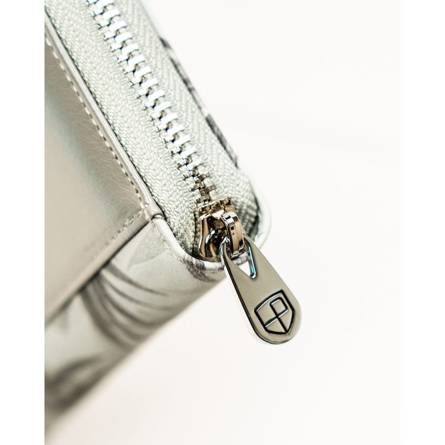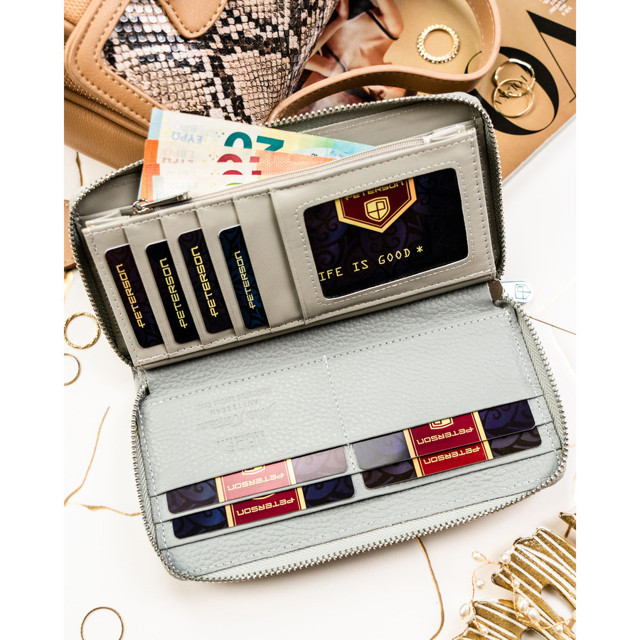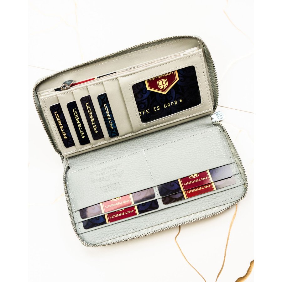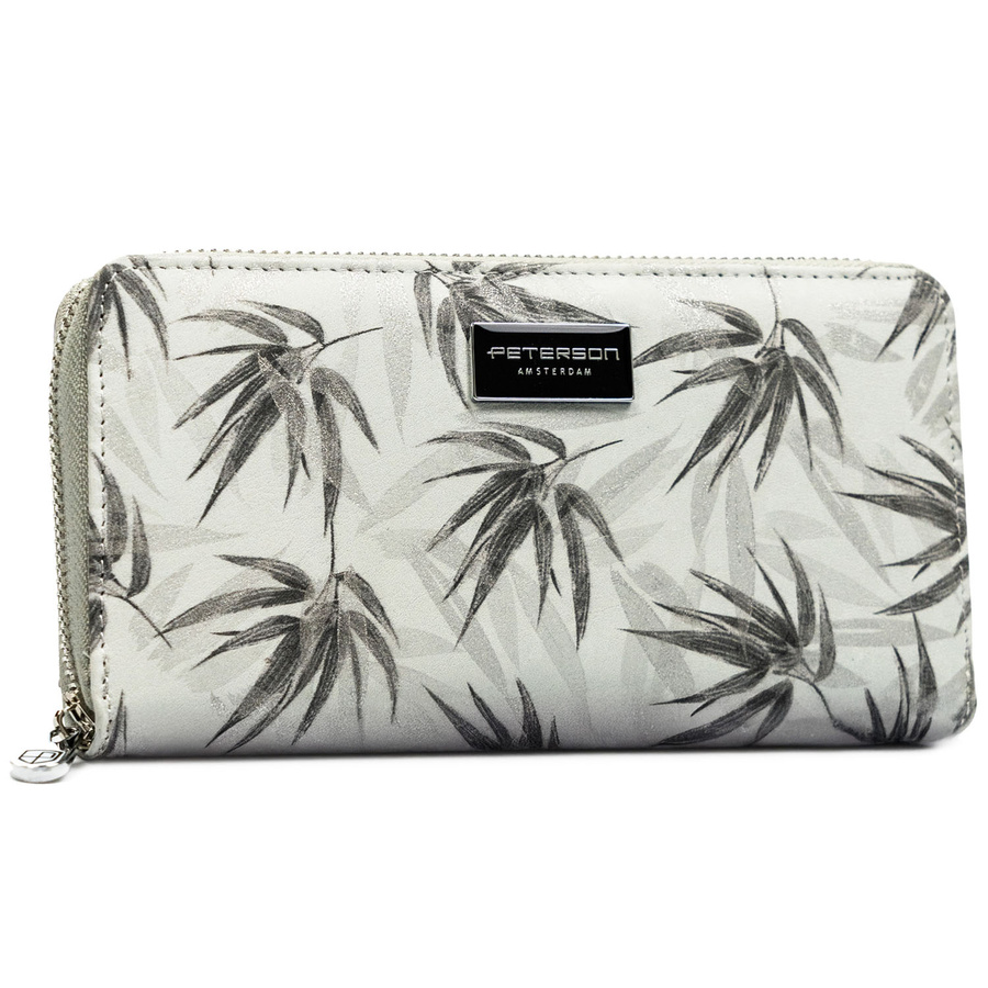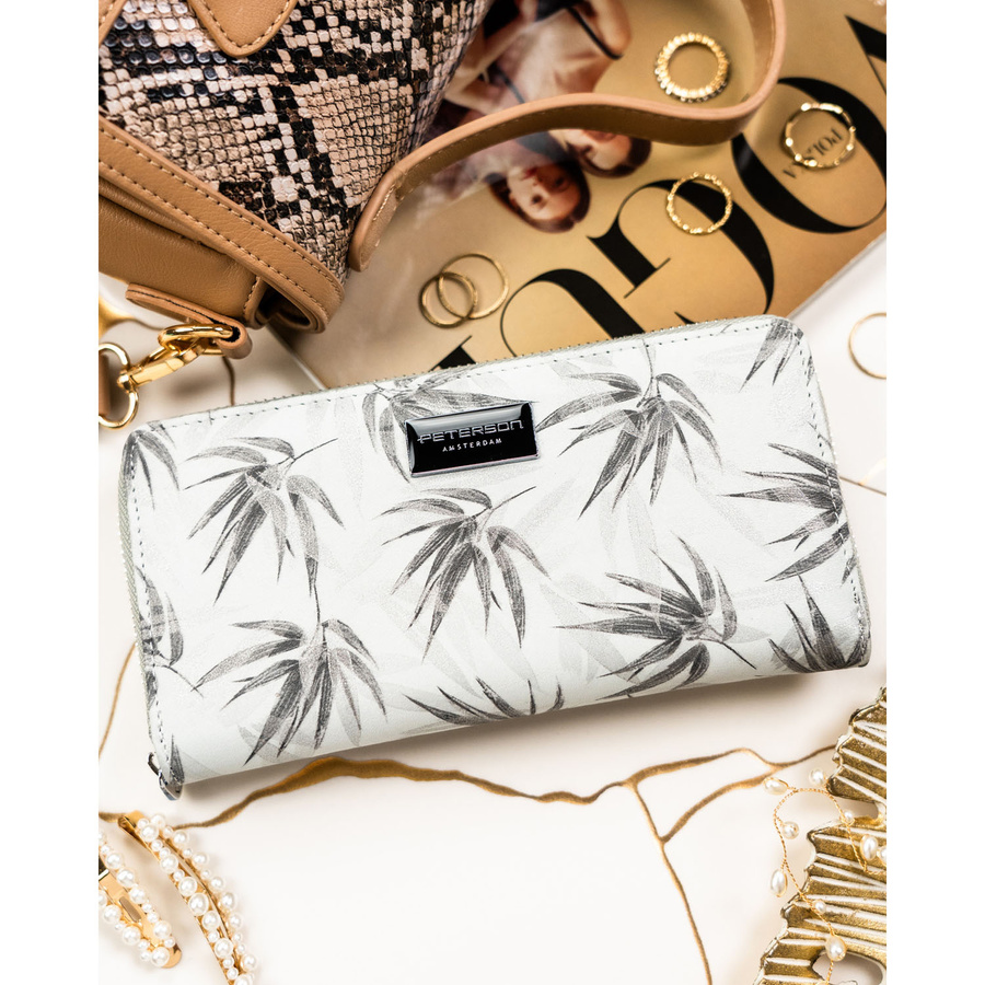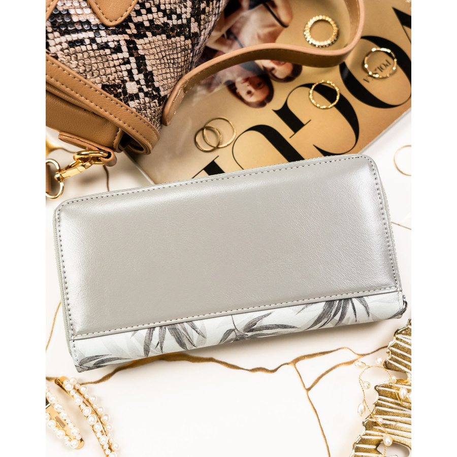 Szary portfel damski w typie piórnika w roślinny wzór, wykonany ze skóry naturalnej i ekologicznej - Peterson