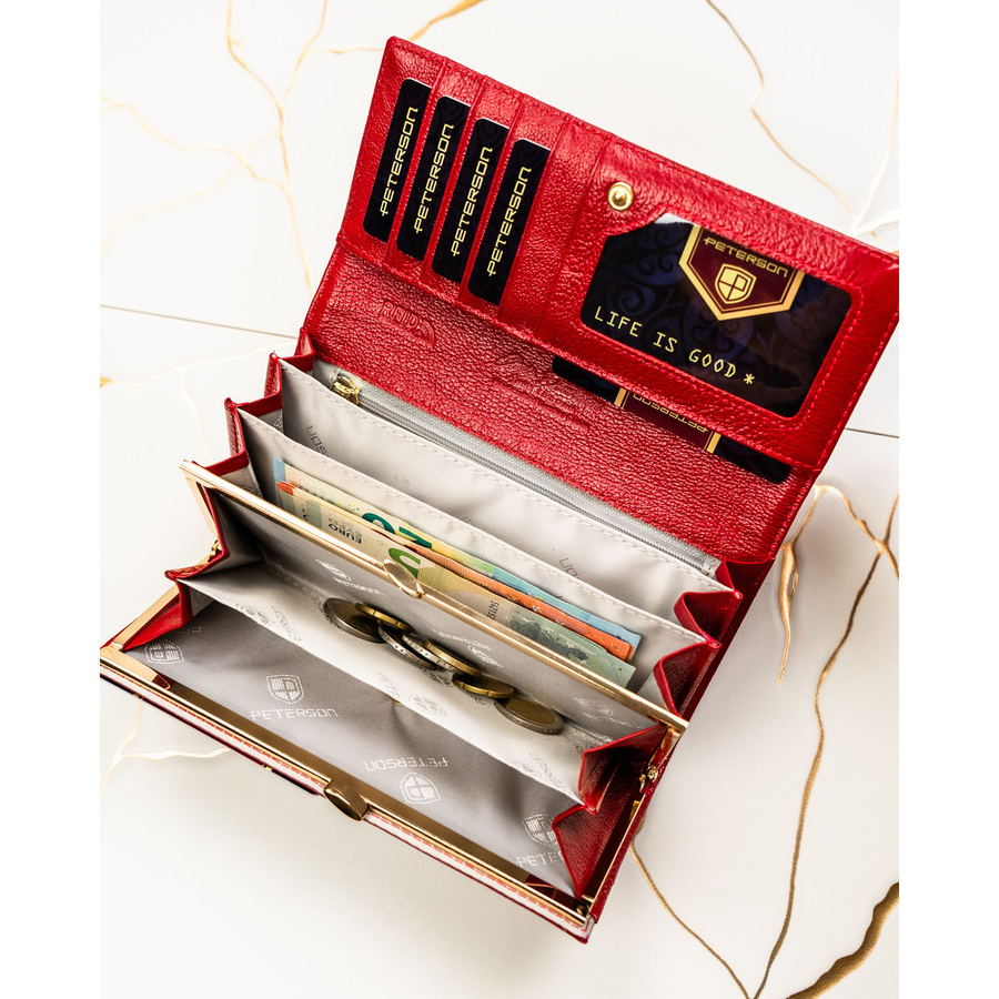 Duży, czerwony portfel damski wykonany ze skóry naturalnej i ekologicznej zamykany zatrzaskiem - Peterson