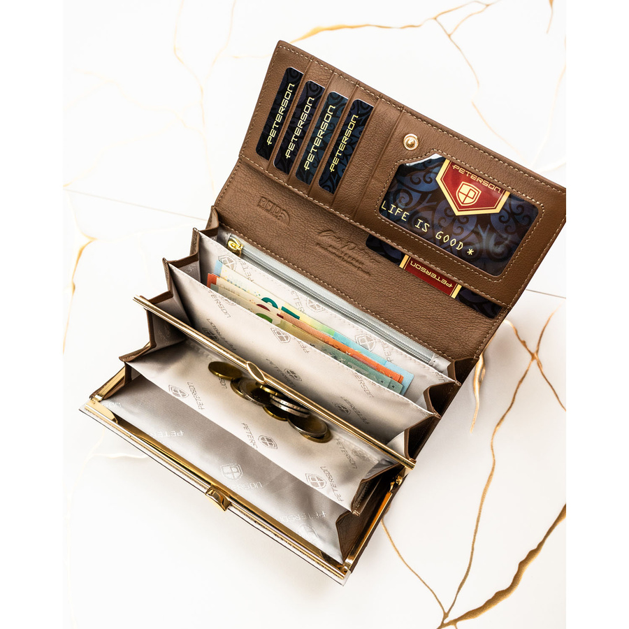 Elegancki portfel damski wykonany ze skóry naturalnej i ekologicznej w brązowym kolorze - Peterson