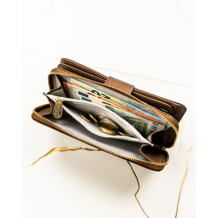 - W środku znajdziesz 2 osobne schowki na banknoty — to idealne rozwiązanie, jeśli używasz kilku walut lub chcesz oddzielić gotówkę na różne cele.