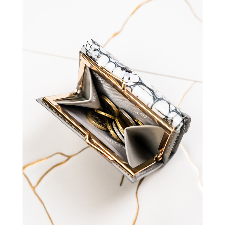 • Wykonany z wysokiej jakości naturalnej skóry w czarnobiałym kolorze z dodatkiem szarości. Wyposażony w system RFID. Portfel zamykany biglem i zatrzaskiem. Zapakowany w firmowe pudełko prezentowe.