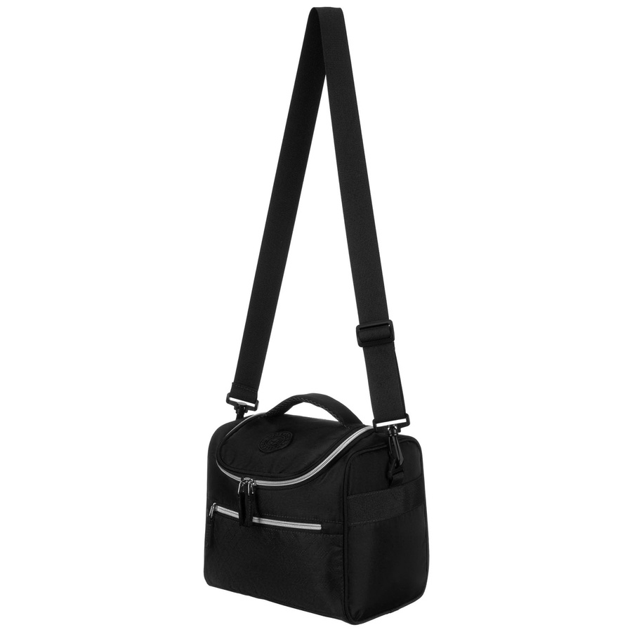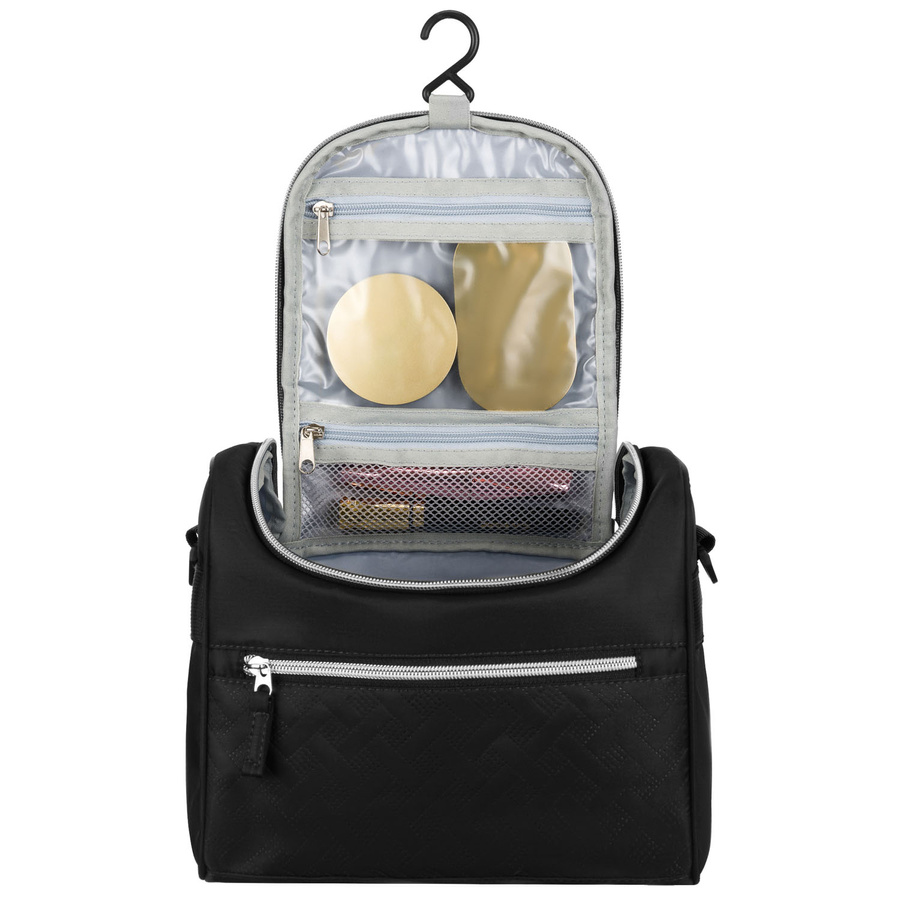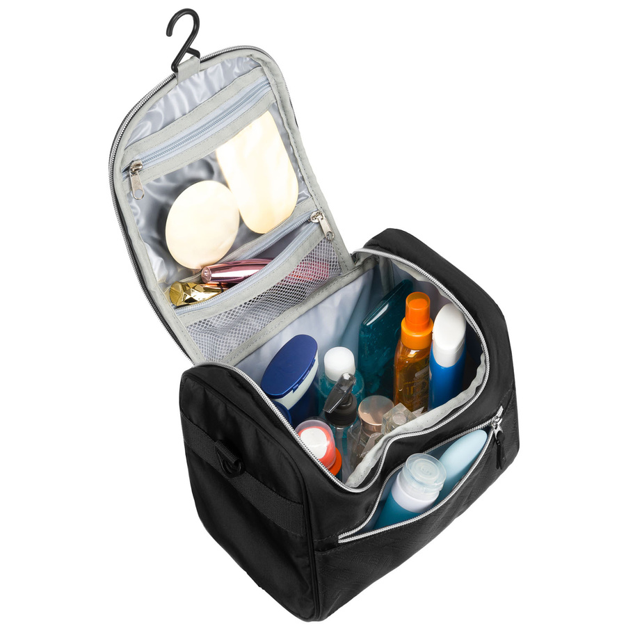Pojemna komora główna z łatwym dostępem pomieści butelki, słoiczki, spray’e i inne większe kosmetyki. Trzy dodatkowe kieszenie, w tym praktyczna siateczkowa i przezroczysta, pozwalają na wygodne uporządkowanie drobnych akcesoriów jak tusze, pomadki czy waciki. Zewnętrzna kieszeń na suwak doskonale sprawdzi się na podręczne drobiazgi. Przemyślany układ przegródek pomaga zachować porządek nawet podczas intensywnych wyjazdów.