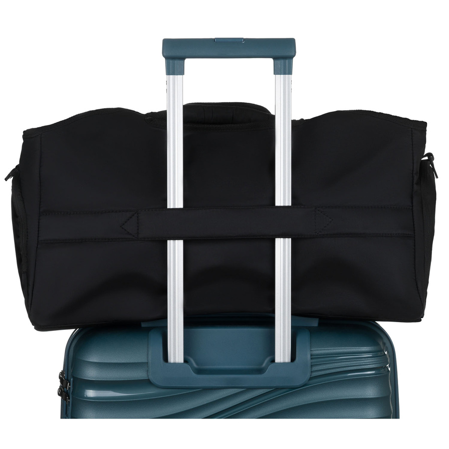 Z tyłu torby znajduje się szeroki pasek do nałożenia na rączkę walizki. To świetne udogodnienie, które pozwala przymocować torbę do bagażu podręcznego i przemieszczać się wygodnie po lotniskach, dworcach czy hotelach – bez obciążania ramion.