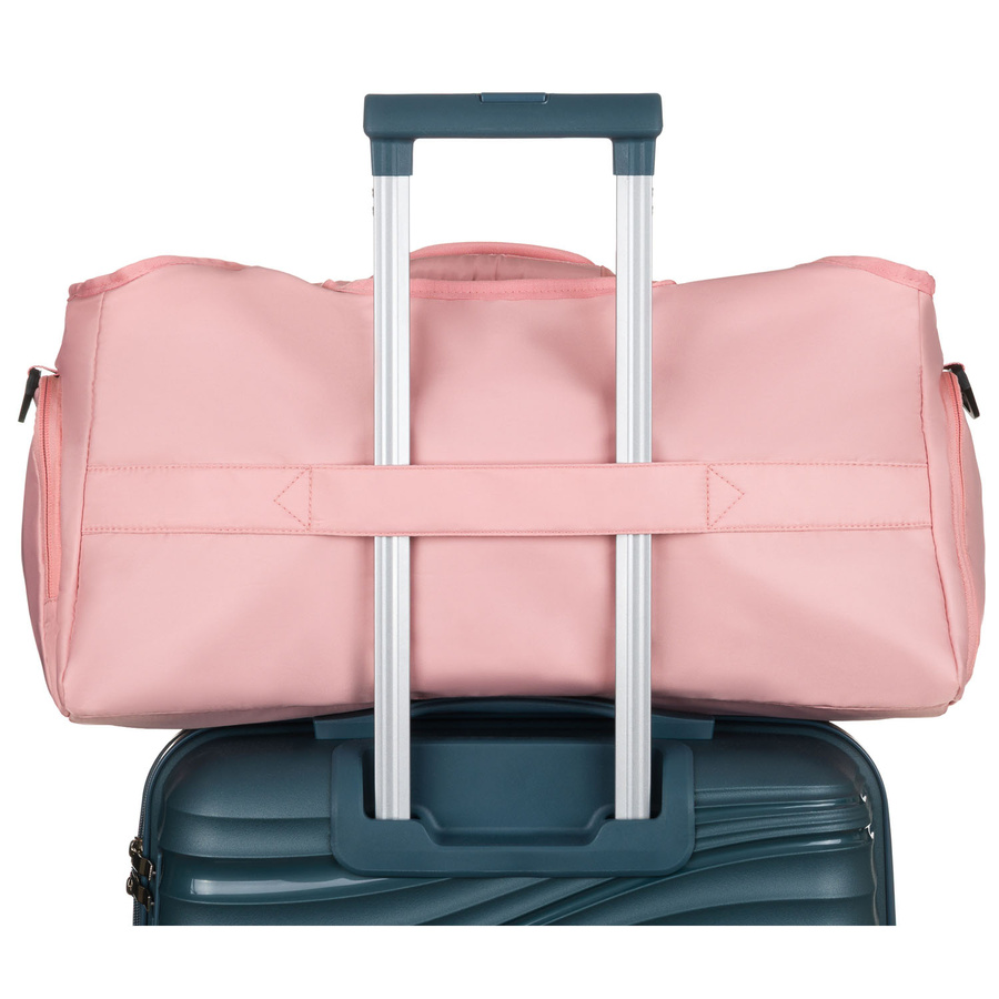 Z tyłu torby znajduje się szeroki pasek do nałożenia na rączkę walizki. To świetne udogodnienie, które pozwala przymocować torbę do bagażu podręcznego i przemieszczać się wygodnie po lotniskach, dworcach czy hotelach – bez obciążania ramion.