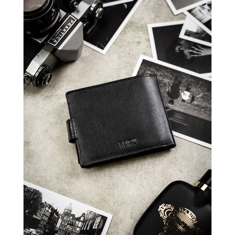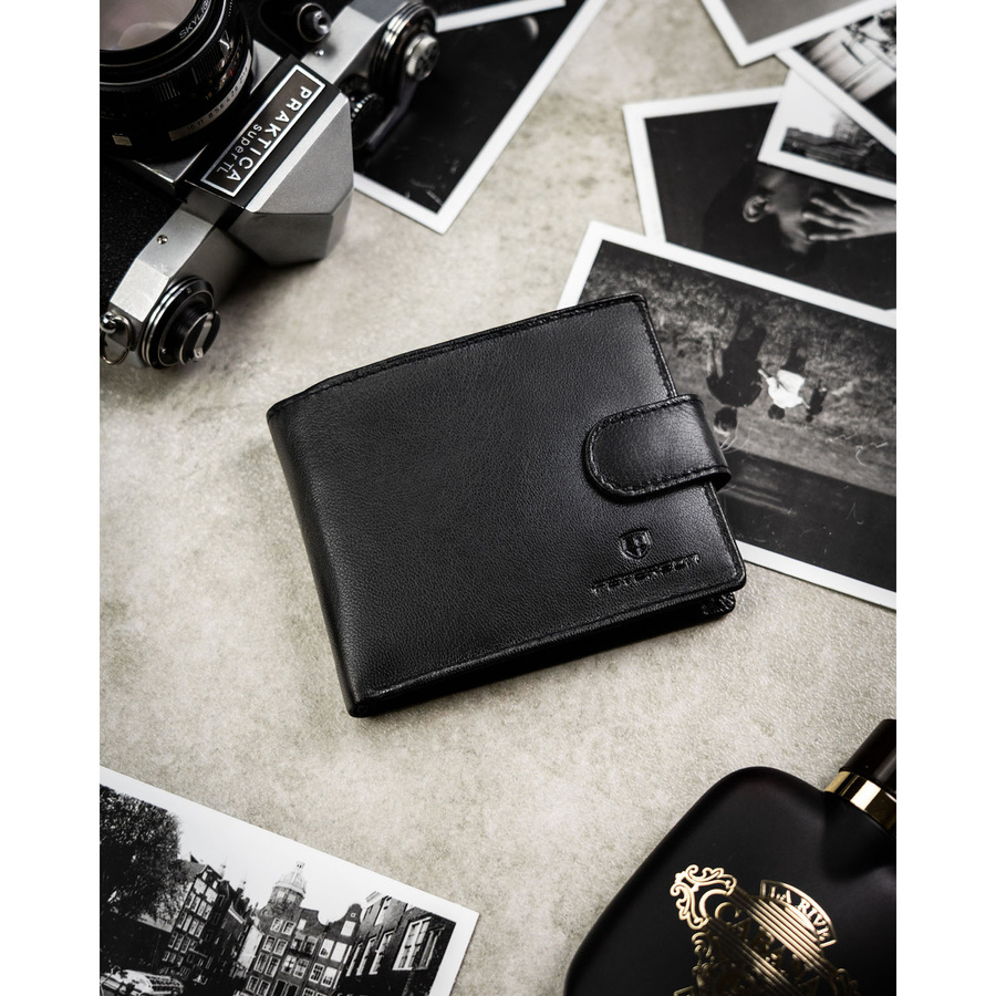 • Zestaw prezentowy dla mężczyzn złożony ze skórzanego, czarnego portfela i breloka. Portfel zamykany na zatrzask, wyposażony w system RFID. Posiada aż 9 przegródek na karty i 4 miejsca na większe dokumenty.