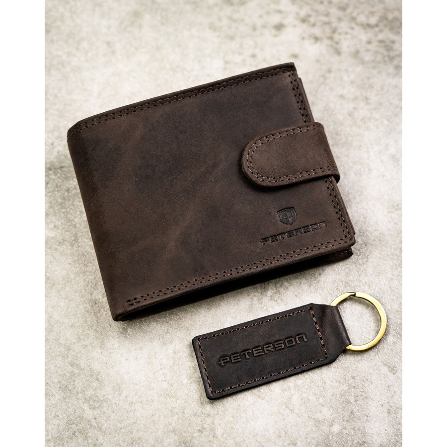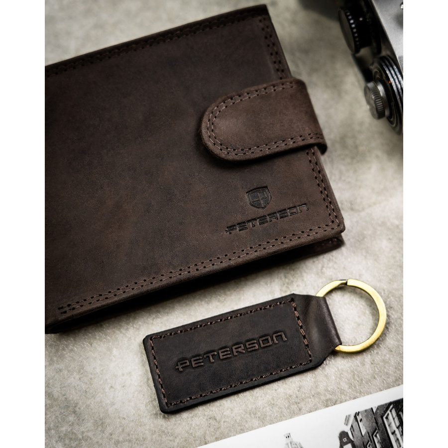 Zestaw prezentowy: brelok i brązowy, skórzany portfel męski z zapięciem na zatrzask - Peterson