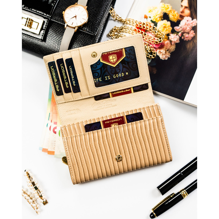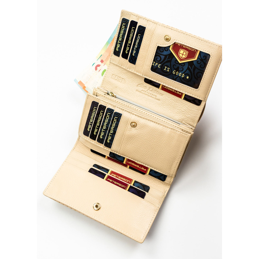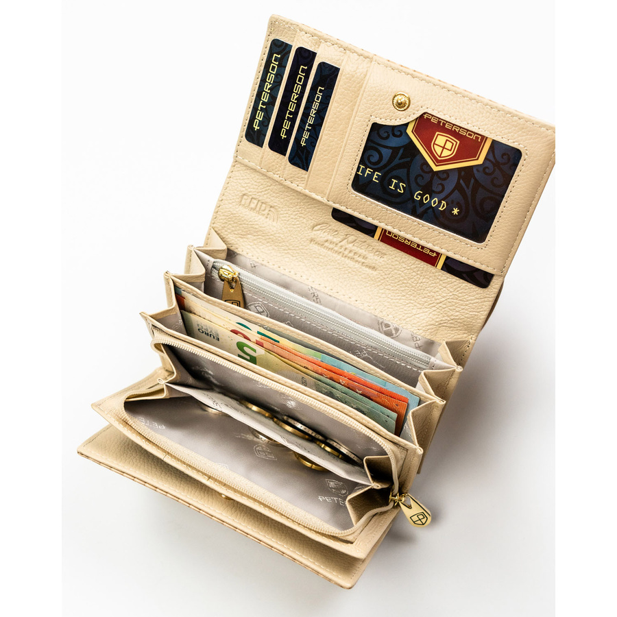 Portfel damski ze skóry naturalnej i ekologicznej w beżowym kolorze ze wzorem plecionki - Peterson
