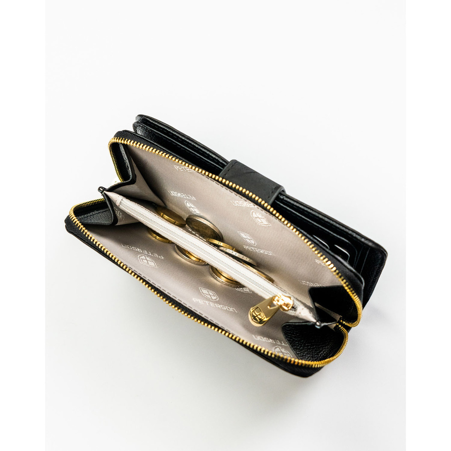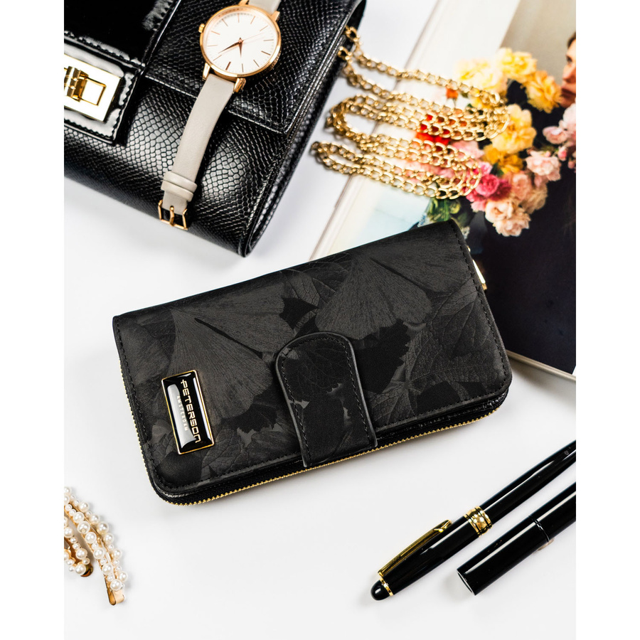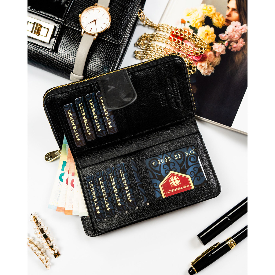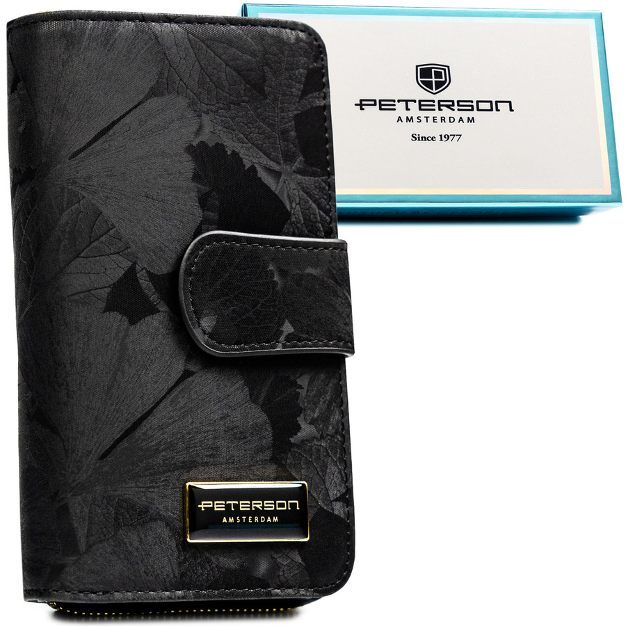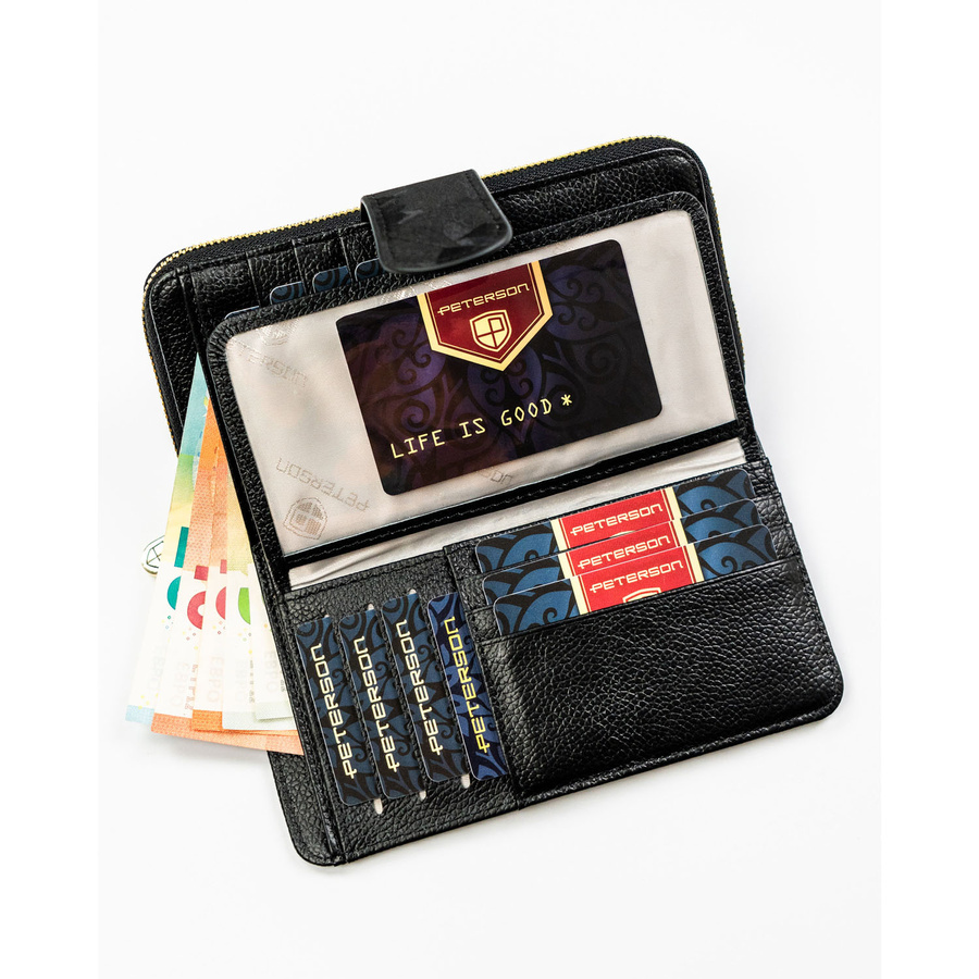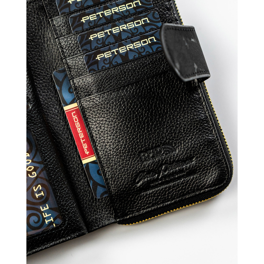 Duży, czarny portfel w orientacji pionowej wykonany ze skóry naturalnej i ekologicznej w czarnym kolorze - Peterson
