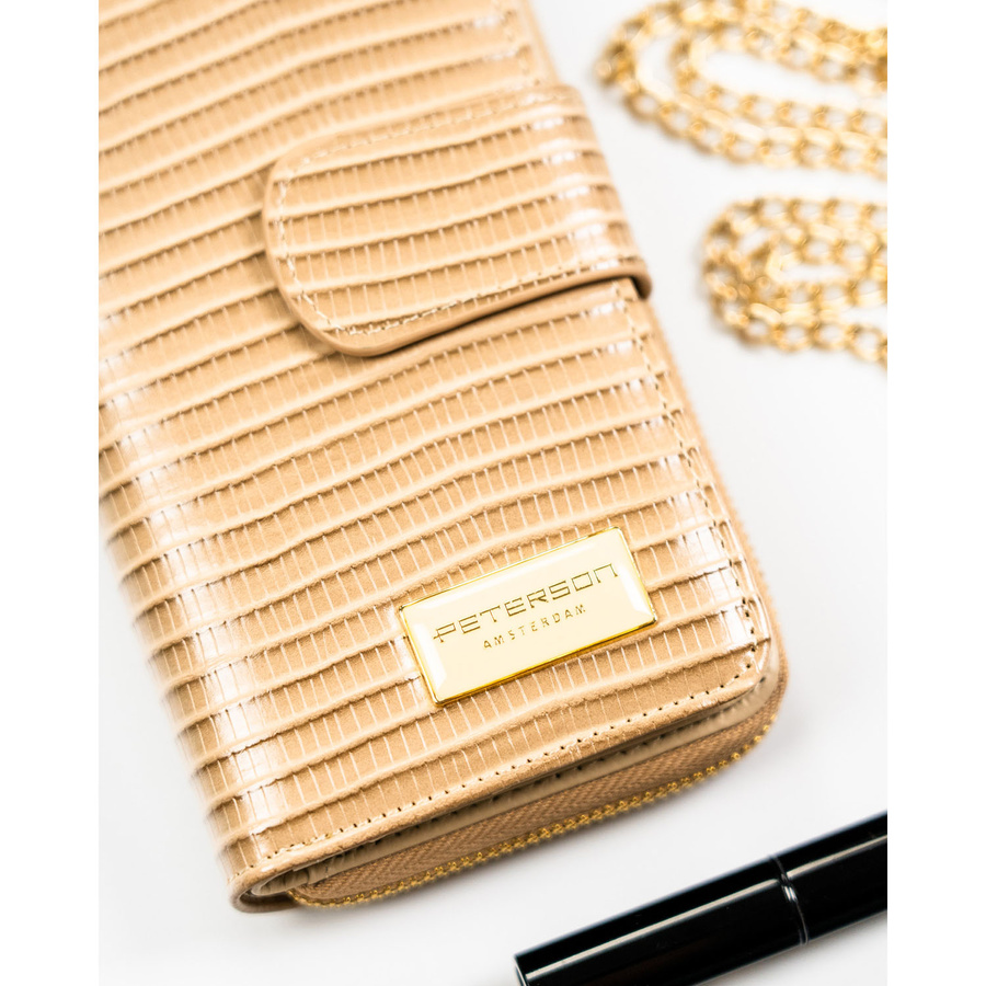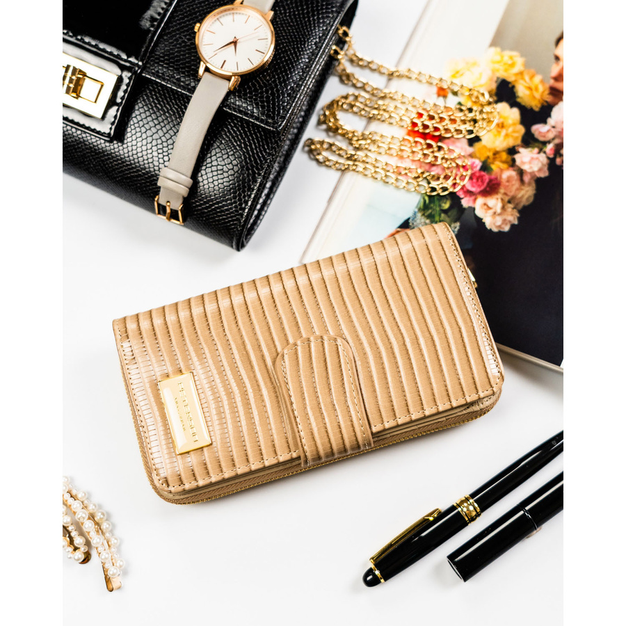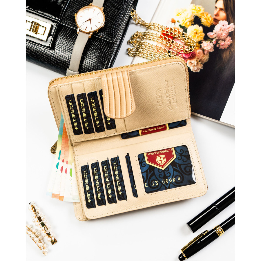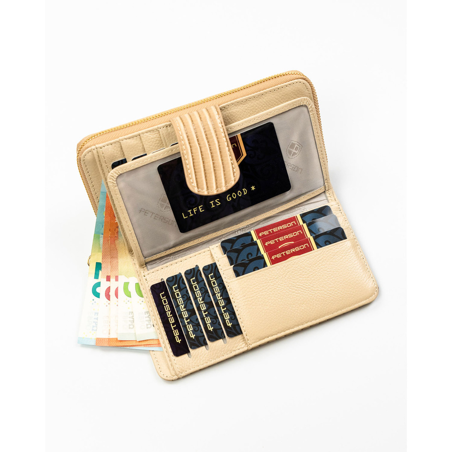 Beżowy portfel w orientacji pionowej wykonany ze skóry naturalnej i ekologicznej ze wzorem w plecionkę - Peterson