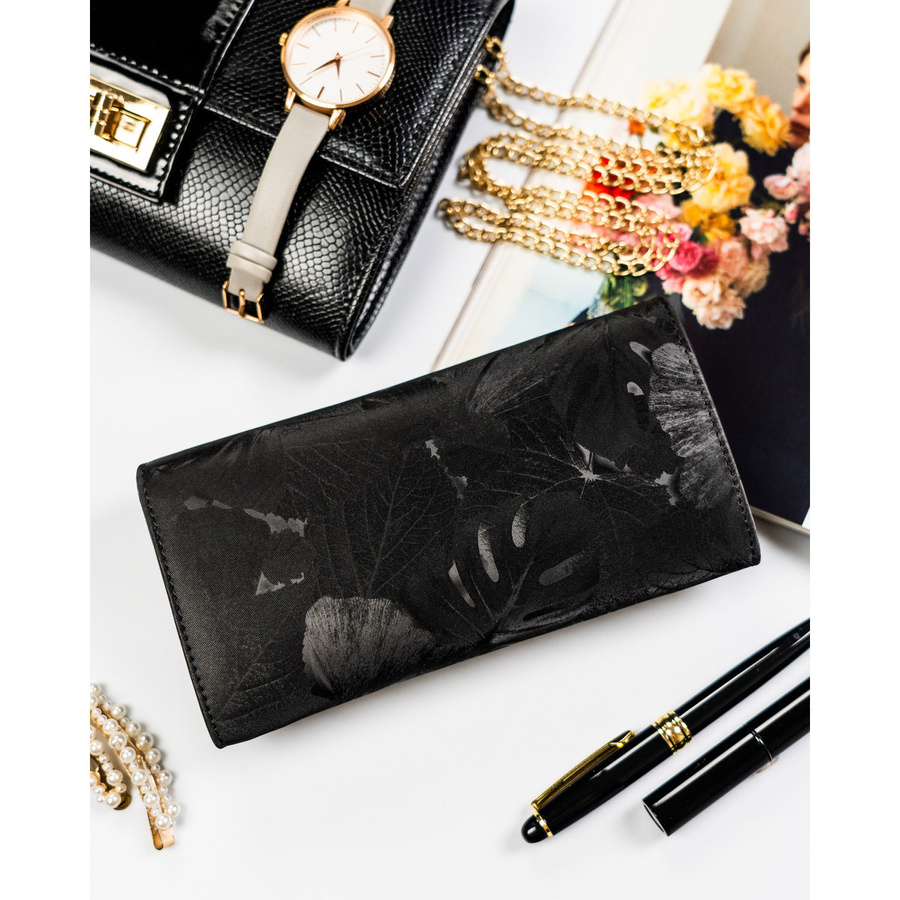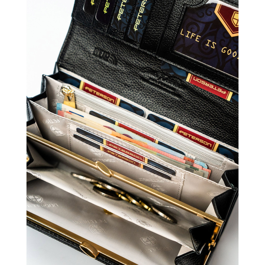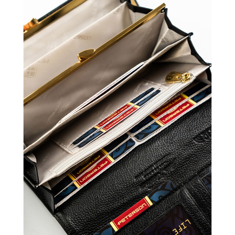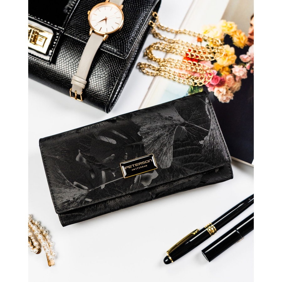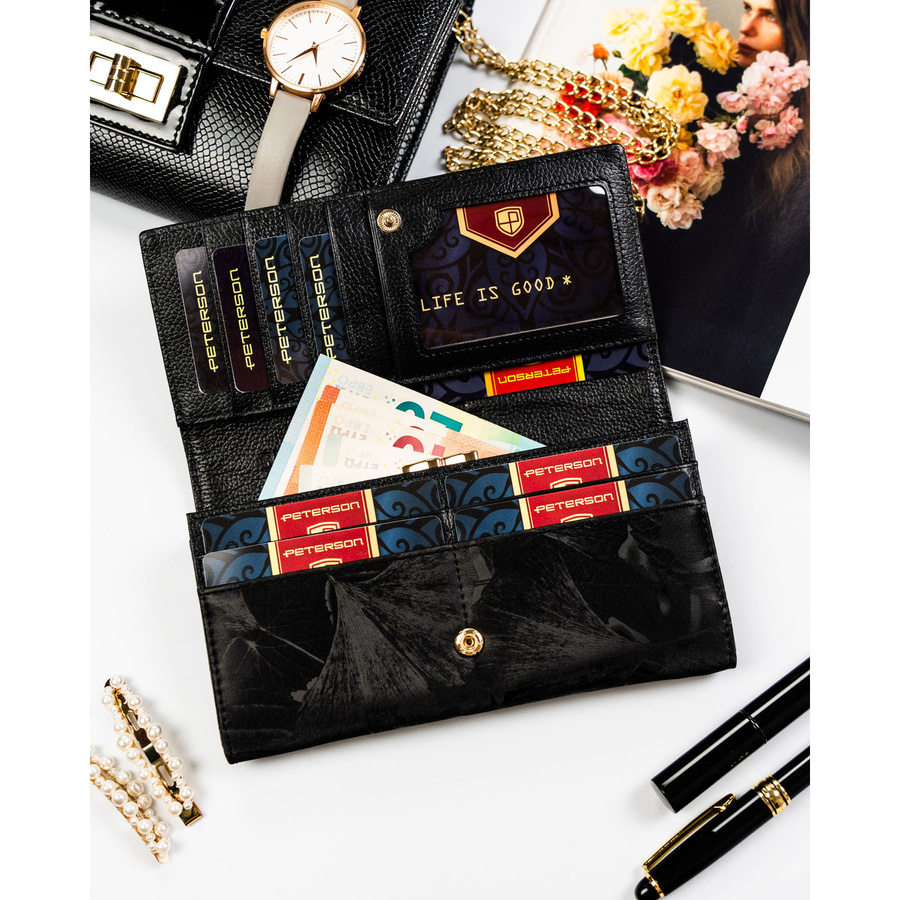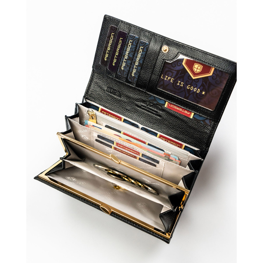 Duży portfel damski ze skóry naturalnej i ekologicznej w czarnym kolorze, zamykany zatrzaskiem - Peterson