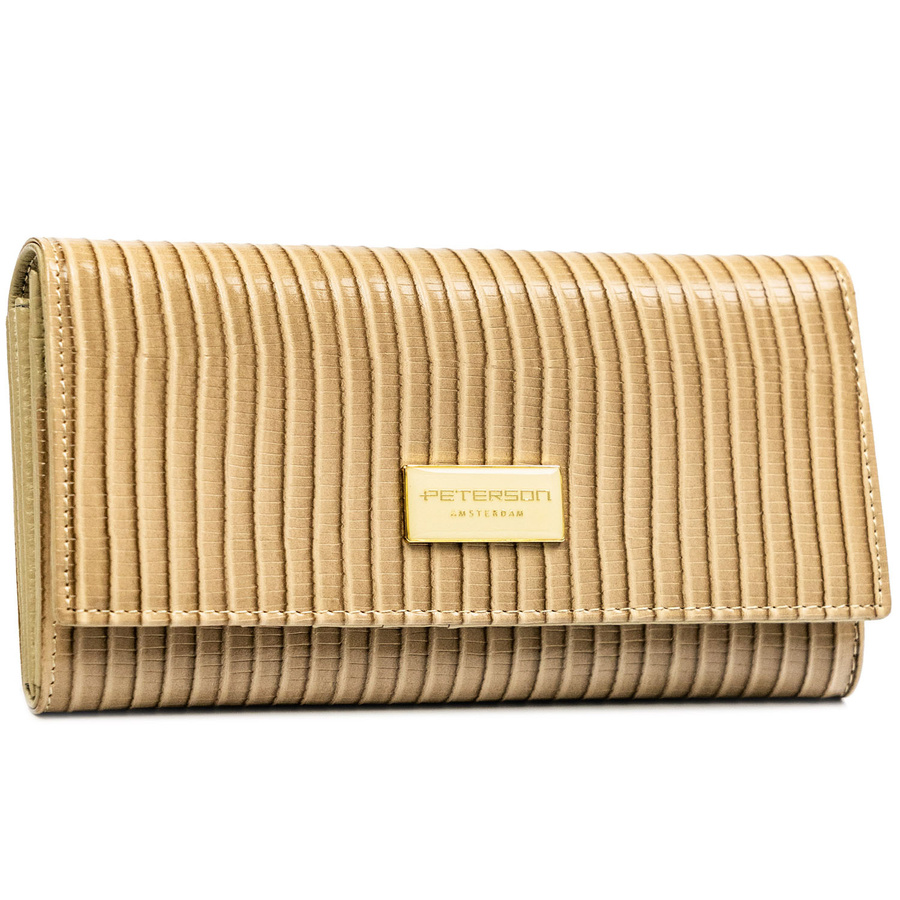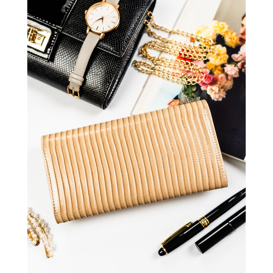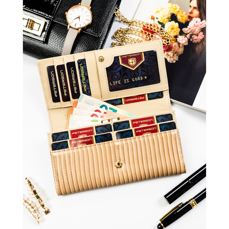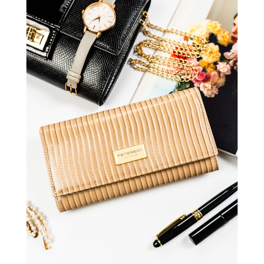 Beżowy portfel damski ze skóry naturalnej i ekologicznej zamykany zatrzaskiem, ozdobiony wzorem w plecionkę - Peterson